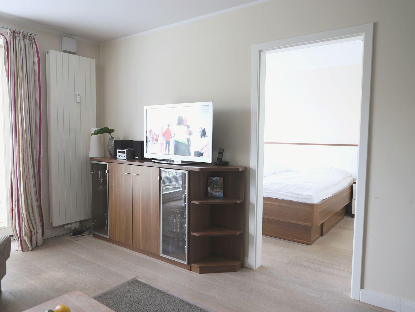 Diese moderne 2-Zimmerwohnung in der Viktoriaresidenz bietet auf ca. 50 m² Platz für 2 bis 3 Personen. Die lichtdurchflutete Wohnung im Erdgeschoss besticht durch ihre hochwertige Ausstattung und zentrale Lage in Westerland. Der Wohnraum verfügt über eine ausziehbare Schlafcouch (120 x 190 cm), einen Flatscreen-TV sowie einen DVD-Player. Die offene, voll ausgestattete Küche mit Cerankochfeld, Backofen, Spülmaschine und Essecke lässt keine Wünsche offen. Das Schlafzimmer ist mit einem Doppelbett (180 x 200 cm) und einem großen Schrank ausgestattet. Das moderne Bad bietet eine bodengleiche Dusche. Weiterhin finden Sie eine Garderobe mit Stauraum für Koffer. Kostenfreies WLAN und Anrufe ins deutsche Festnetz gehören ebenfalls zur Ausstattung. Die sonnige Westterrasse mit Tisch, Stühlen und Strandkorb lädt zum Verweilen ein. Die gesamte Wohnung (außer Bad) ist mit hochwertigem Parkett ausgestattet. Im Untergeschoss des Hauses stehen eine Waschmaschine mit Münzzähler und ein Trockenraum zur Verfügung. Der Tiefgaragenstellplatz (Durchfahrtshöhe 2,0 m) ist kostenlos. Der Fahrradkeller bietet zusätzlichen Stauraum für Fahrräder, wobei ein Stellplatz nicht garantiert werden kann. Die Wohnung liegt nur wenige Gehminuten vom Bahnhof, der Fußgängerzone, der Sylter Welle und dem Strand entfernt.
