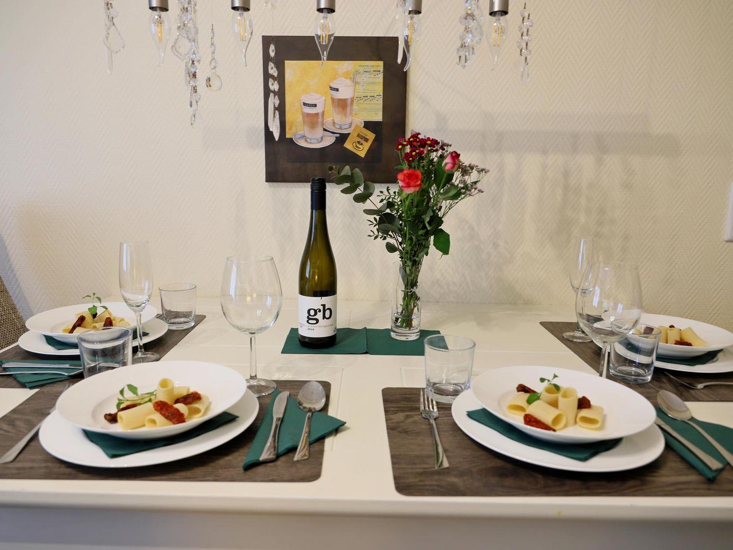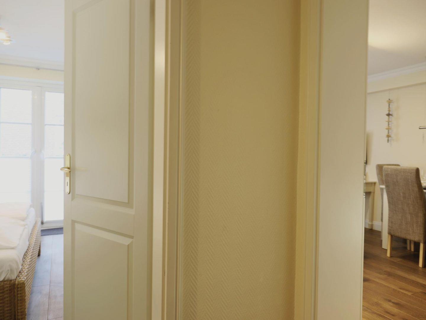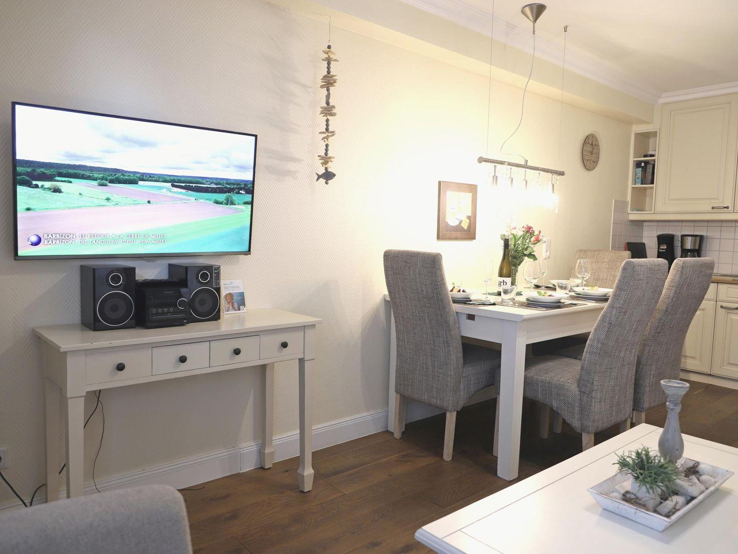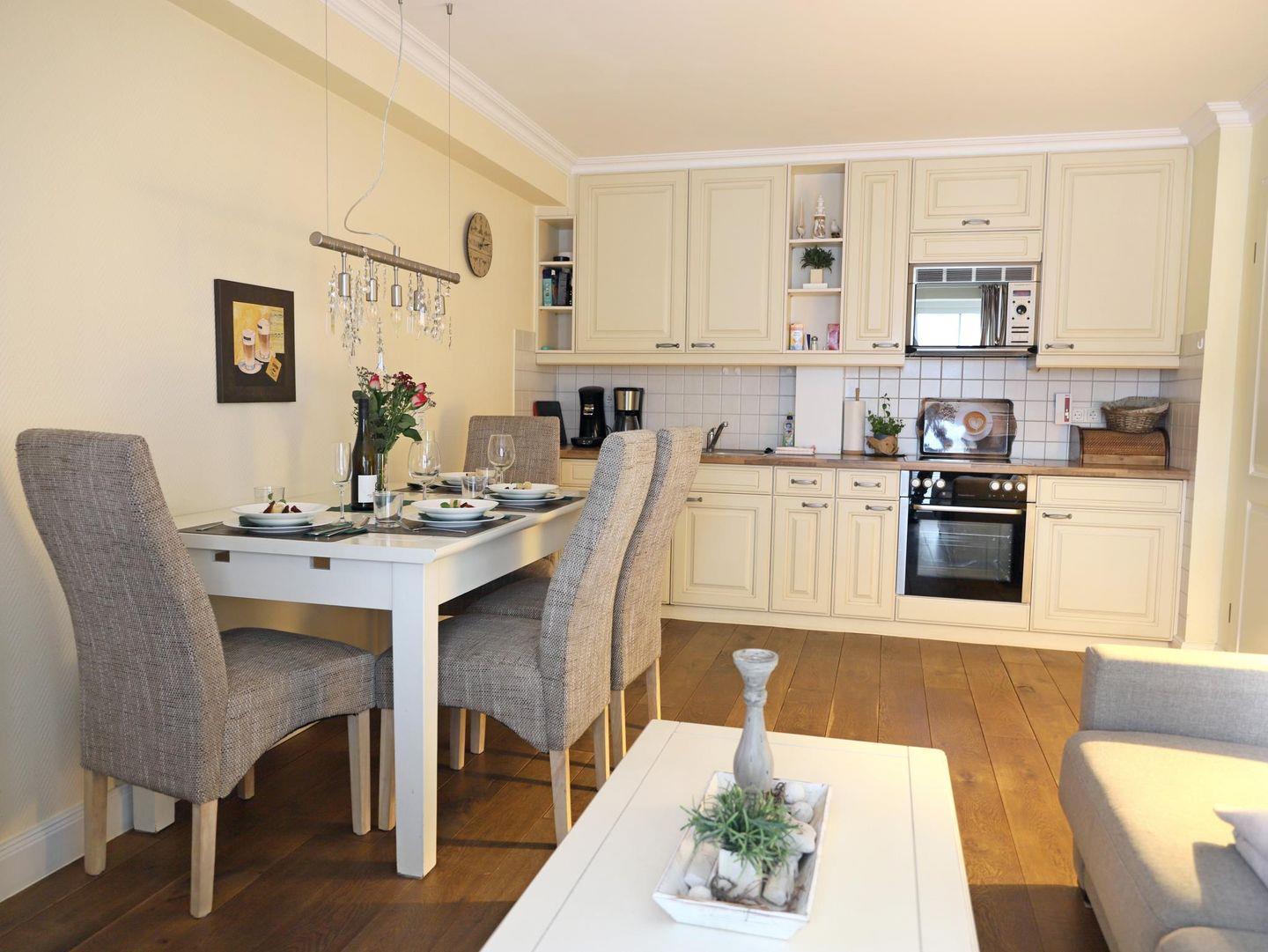 Diese komfortable 2-Zimmer-Erdgeschosswohnung bietet auf 45 m² Platz für bis zu 4 Personen. Das Wohnzimmer ist mit einem gemütlichen Schlafsofa (160 x 200 cm), Flatscreen-TV und Stereoanlage ausgestattet. Die moderne Küchenzeile verfügt über ein 4-Platten-Cerankochfeld, Mikrowelle, Geschirrspüler, Kühlschrank und Kaffeemaschine. Das separate Schlafzimmer bietet ein Doppelbett (180 x 200 cm) und ebenfalls einen Flatscreen-TV. Das Badezimmer überzeugt mit einer Dusche und WC. Genießen Sie entspannte Stunden auf der sonnigen Süd-Terrasse mit Gartentisch, Stühlen und eigenem Strandkorb. Im Gemeinschaftskeller stehen Ihnen eine Sauna (gegen Münzeinwurf) sowie Waschmaschine und Trockner zur Verfügung. Ein kostenfreier Stellplatz befindet sich direkt auf dem Grundstück. Fahrradständer sind vorhanden (ohne Platzgarantie). Haustiere sind nicht erlaubt.