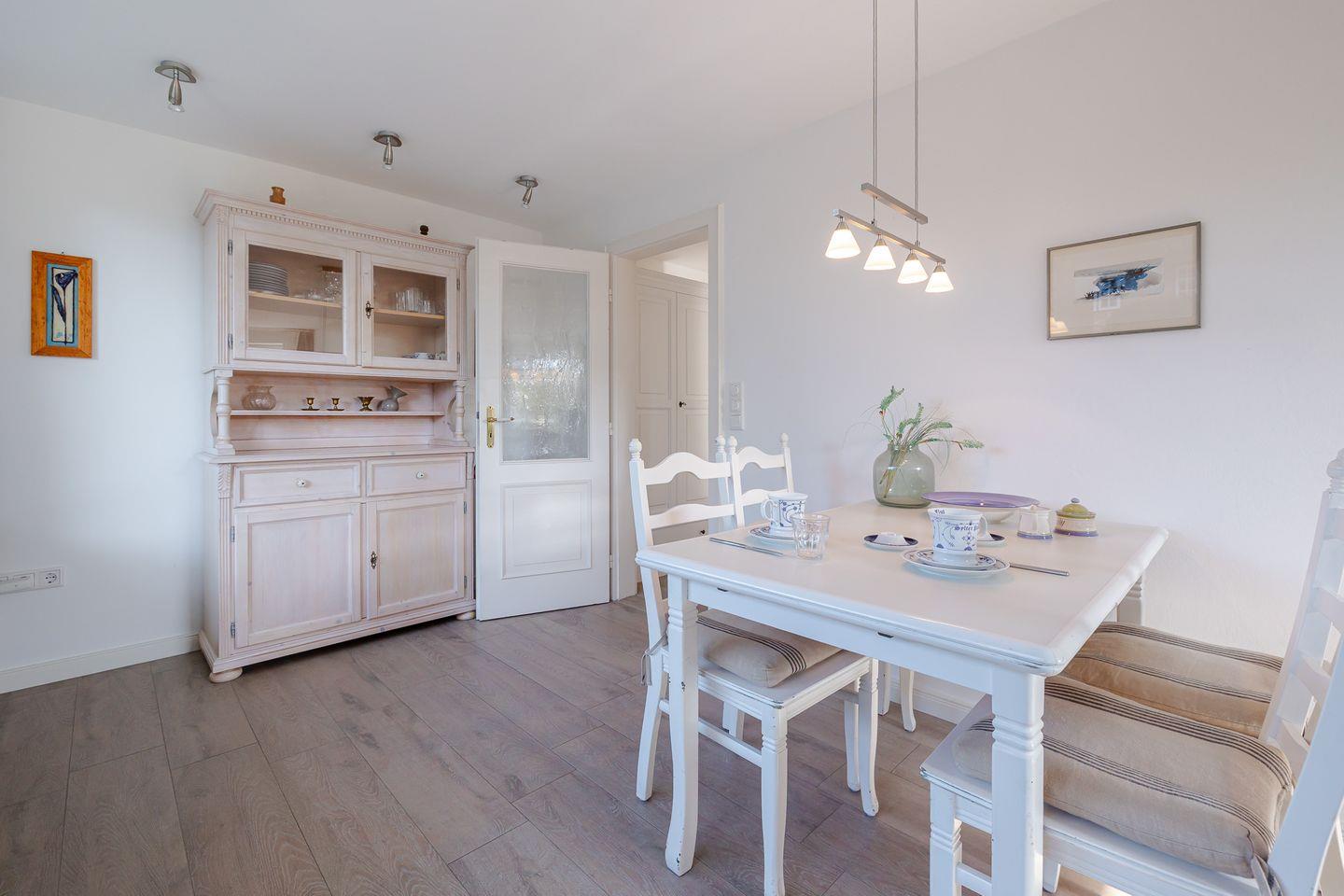 Die Ferienwohnung ist modern und komfortabel eingerichtet und verfügt über zwei gemütliche Schlafzimmer, die zum Entspannen einladen. Das helle und freundliche Wohn- und Esszimmer ist der ideale Ort für gesellige Abende oder um nach einem aufregenden Tag am Strand zur Ruhe zu kommen. Der Essbereich ist perfekt für gemeinsame Mahlzeiten und die offene, geschlossene Küche bietet alles, was Sie benötigen, um Ihre kulinarischen Wünsche zu erfüllen. Ausgestattet mit einem Ceranherd, Kühlschrank, Spülmaschine, Kaffeemaschine und vielen weiteren Küchenutensilien, wird das Kochen zum Vergnügen.