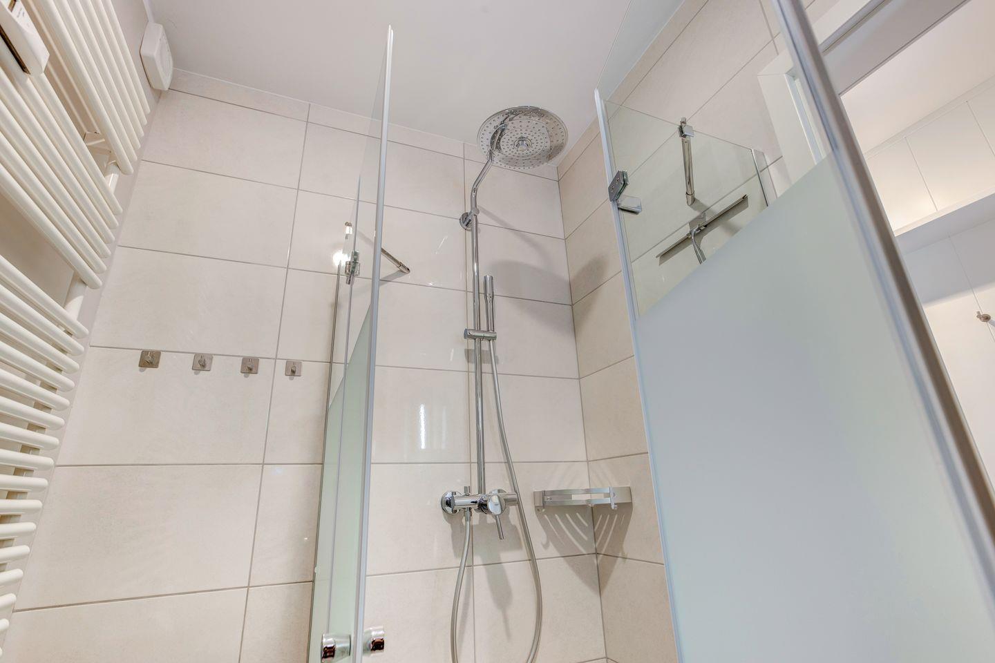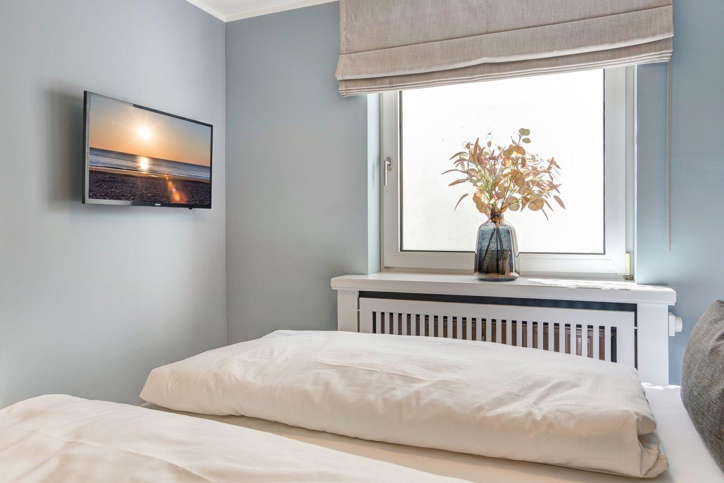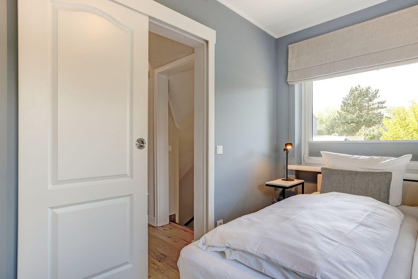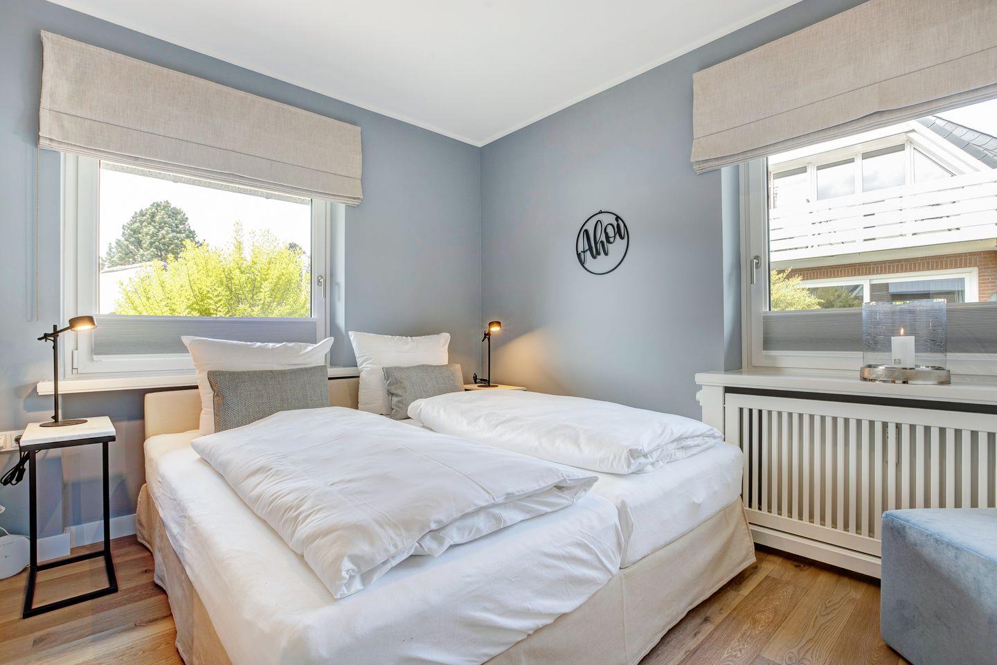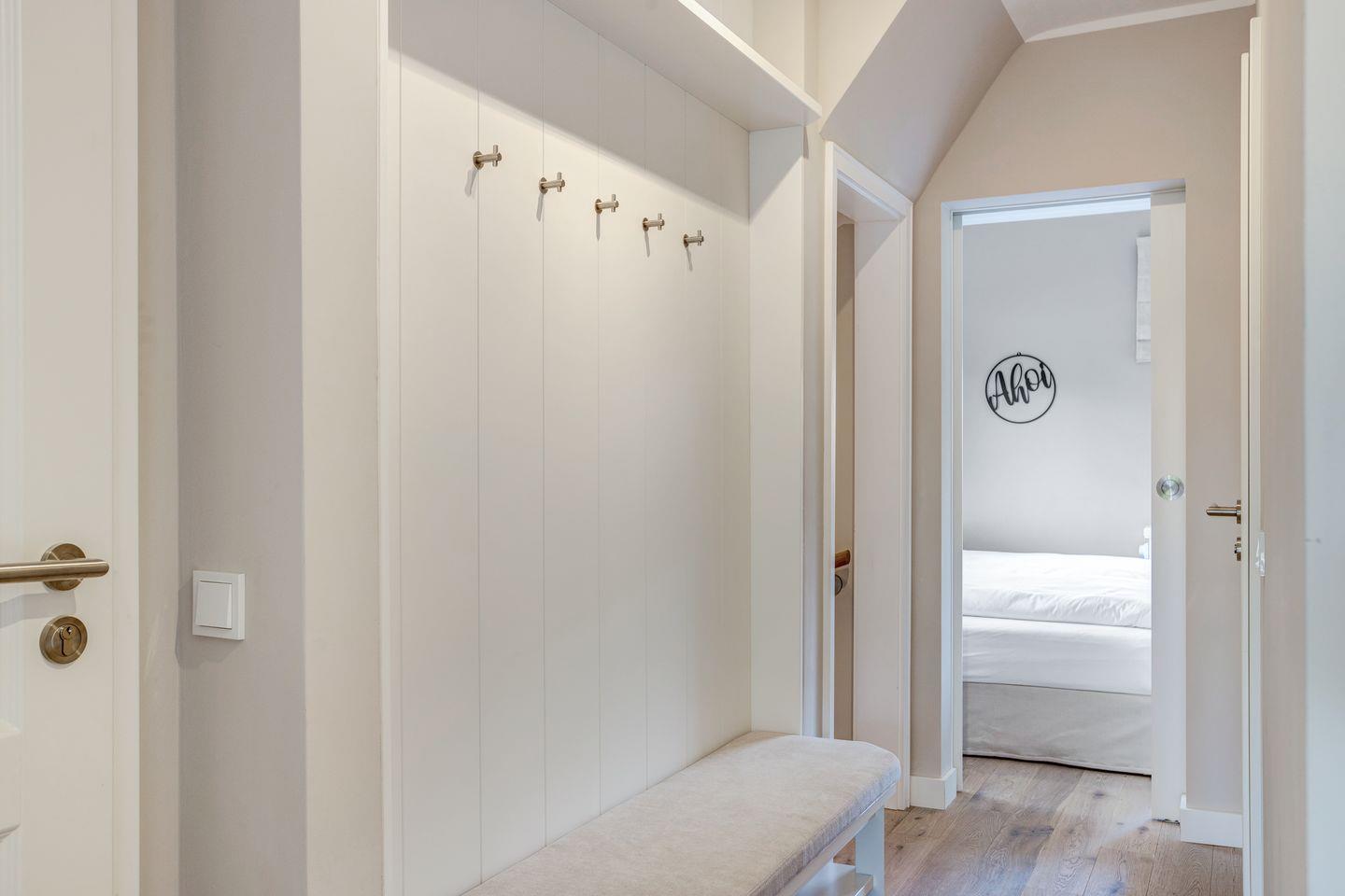 Ebenfalls im Erdgeschoss befindet sich auch eins der insgesamt drei Schlafzimmer mit komfortablen Polsterbett sowie hochwertigen Einbauschränken für die Urlaubsgarderobe. Gleich nebenan dann das ganz in Weiß gehaltene Duschbad mit Regendusche für den perfekten Start in den Tag.