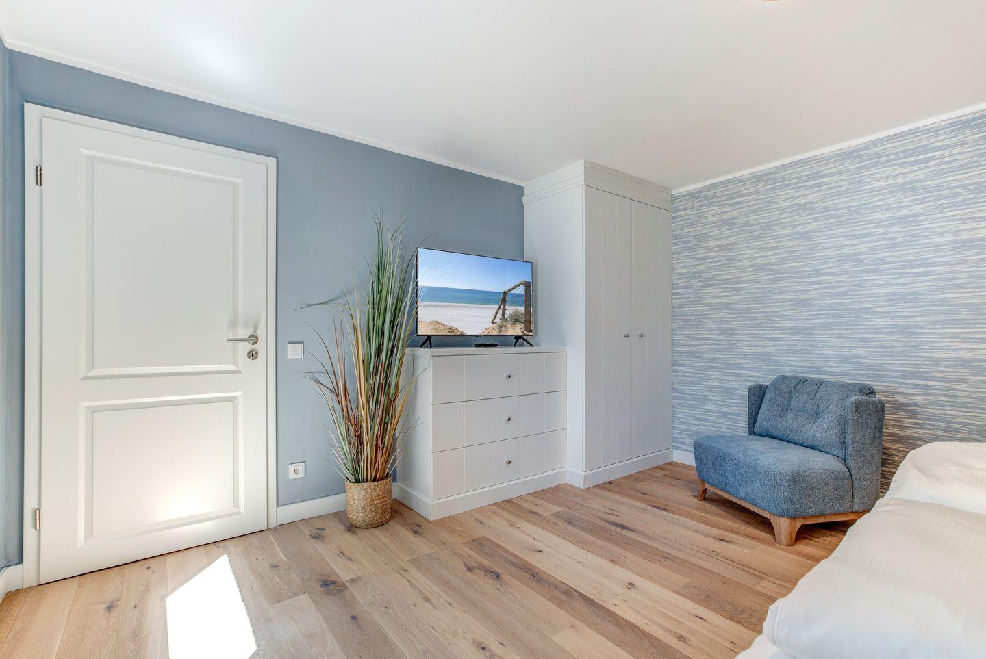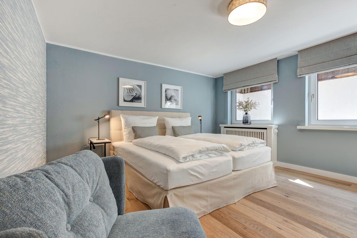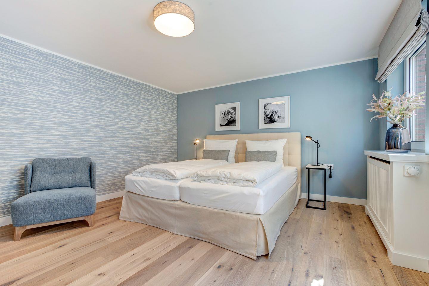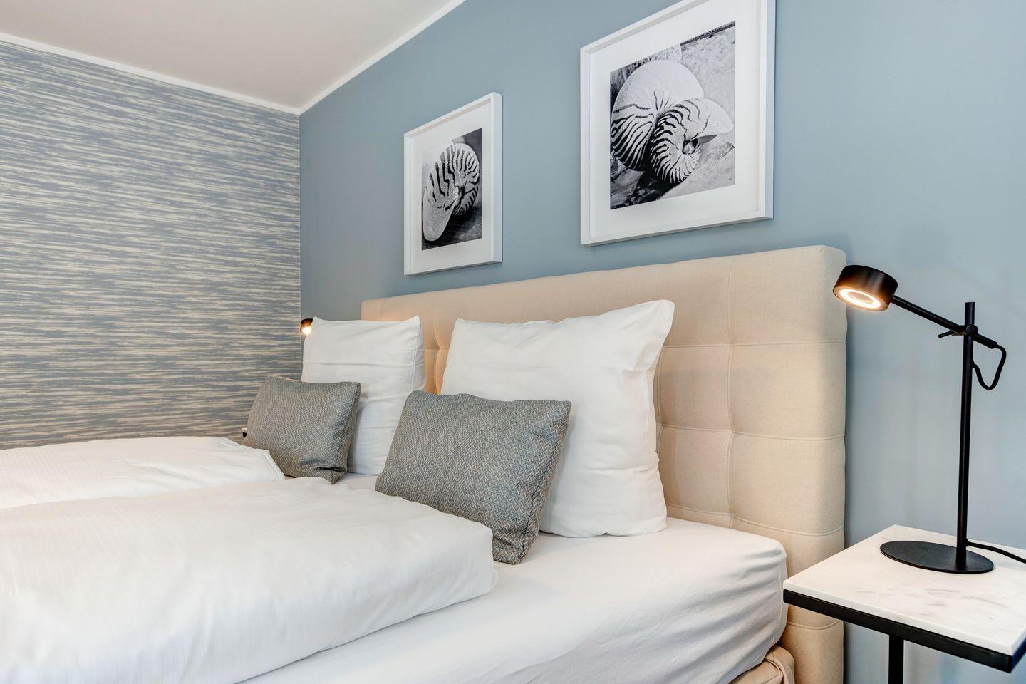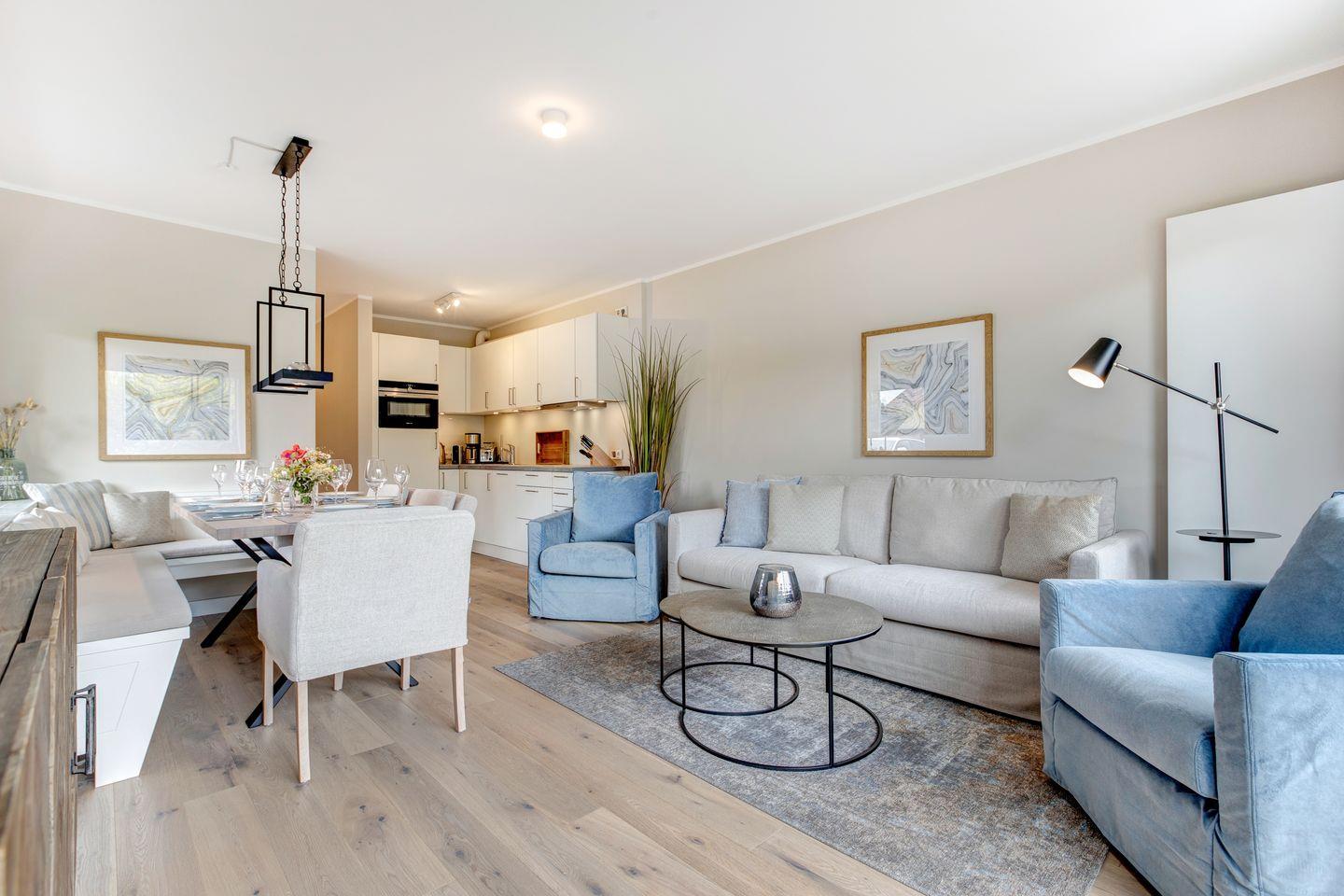 Sandfarbene und blaue Wände sowie ein edler Holzfußboden rahmen das farblich darauf abgestimmte Interieur ein. Ein Zitat an Strand und Meer. Ein Appartement, das zum Entspannen und Wohlfühlen einlädt. Zeitlos, elegant und gemütlich.