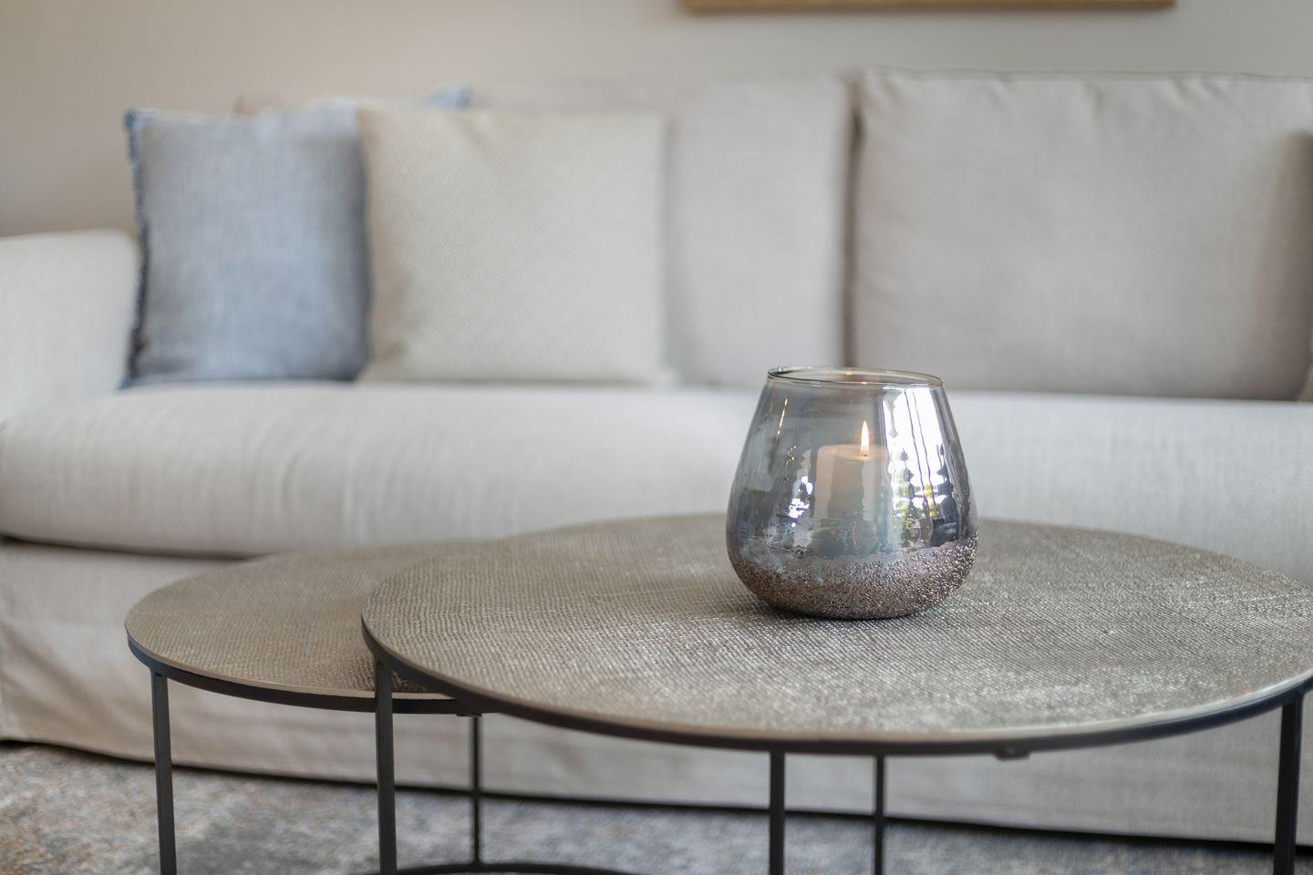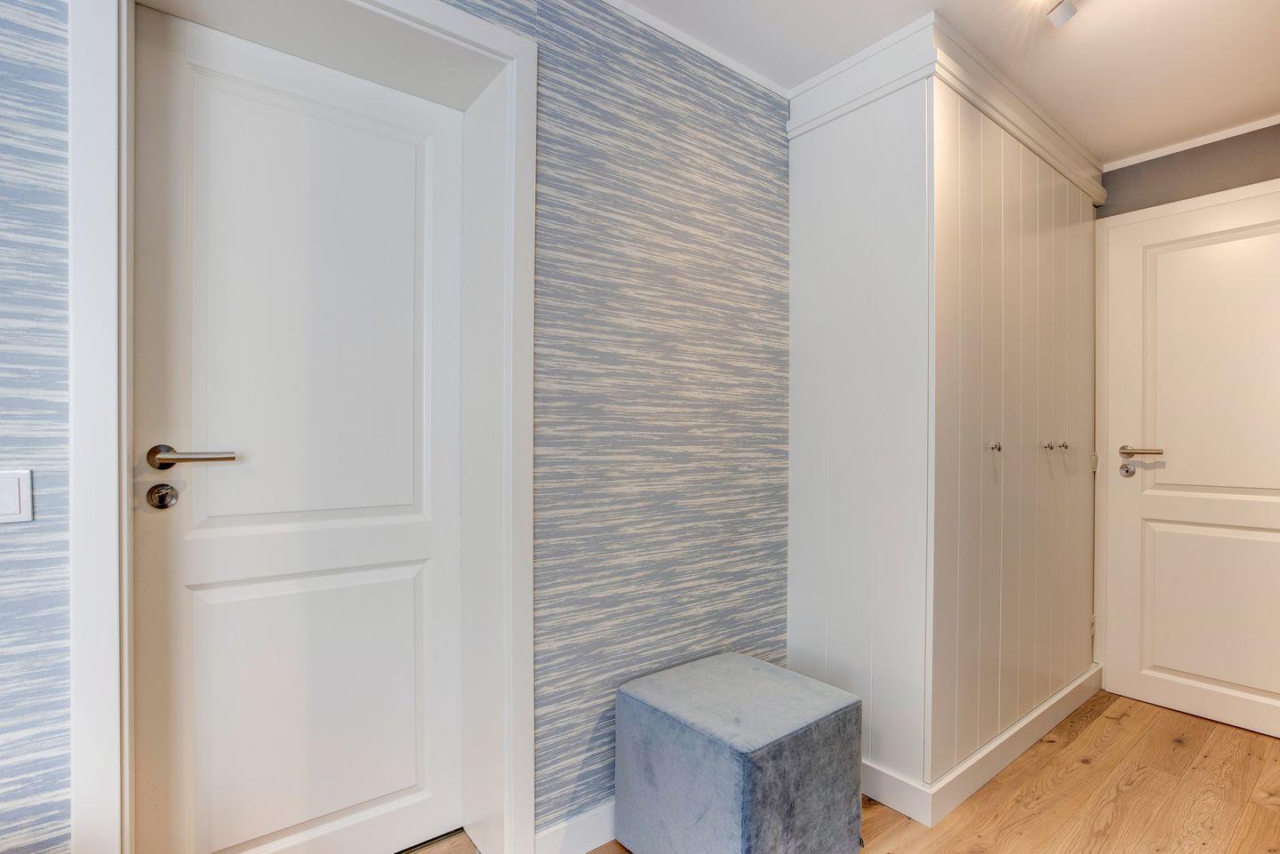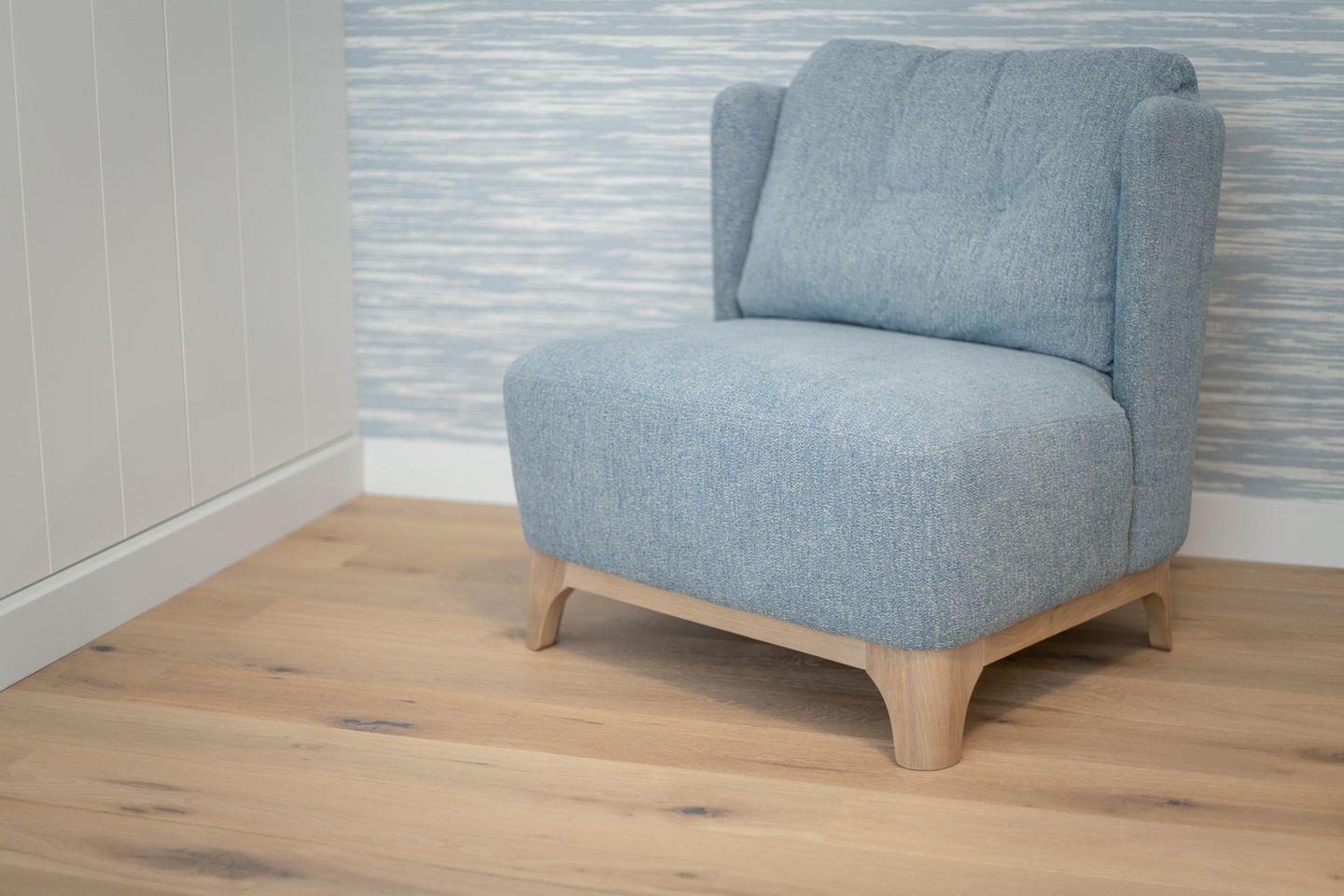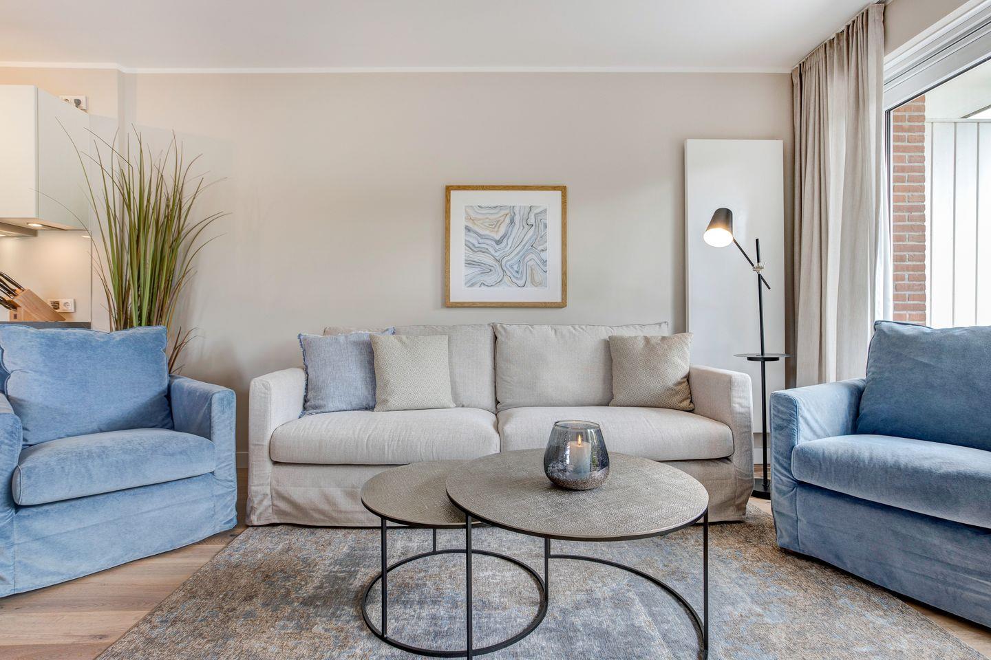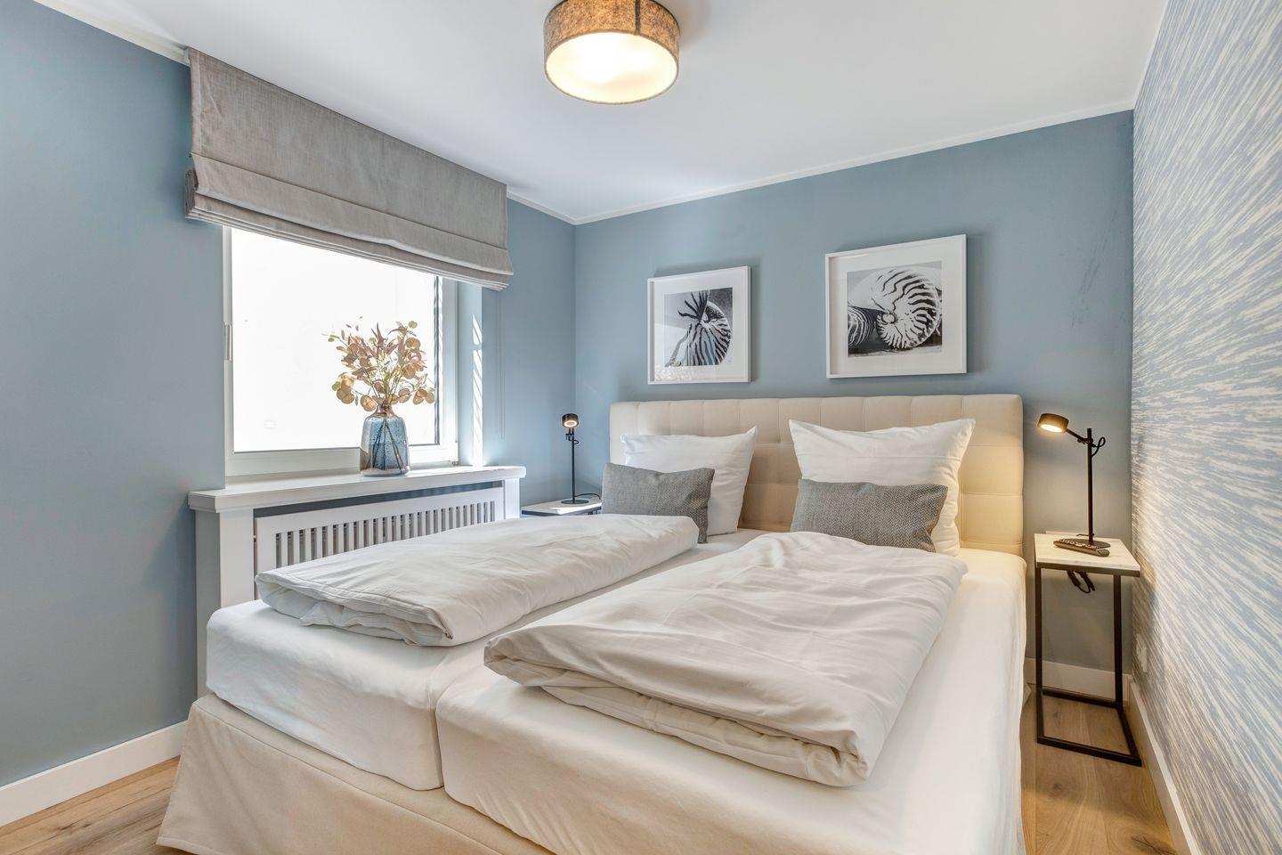 Sandfarbene und blaue Wände sowie ein edler Holzfußboden rahmen das farblich darauf abgestimmte Interieur ein. Ein Zitat an Strand und Meer. Ein Appartement, das zum Entspannen und Wohlfühlen einlädt. Zeitlos, elegant und gemütlich.