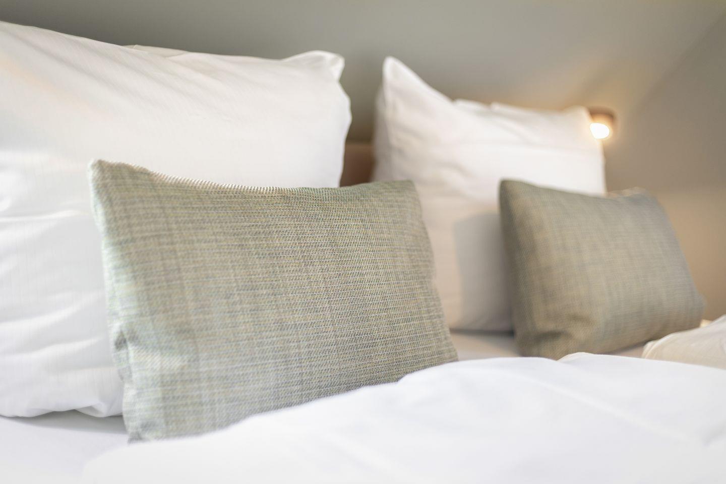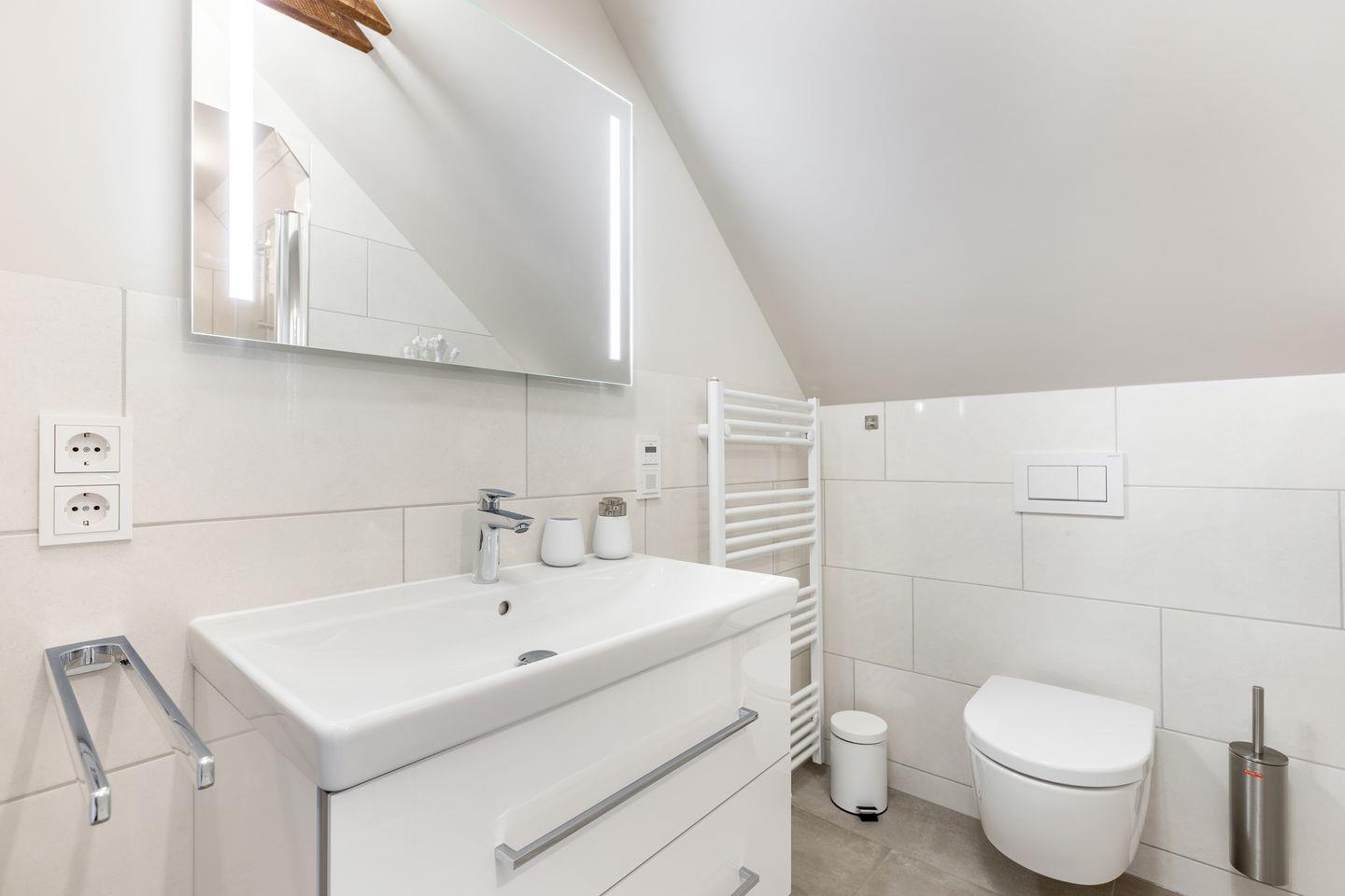 Ebenfalls im Obergeschoss befindet sich auch eins der insgesamt zwei Schlafzimmer mit komfortablen Polsterbett sowie hochwertigen Einbauschränken für die Urlaubsgarderobe. Gleich nebenan dann das ganz in Weiß gehaltene Duschbad für den perfekten Start in den Tag.