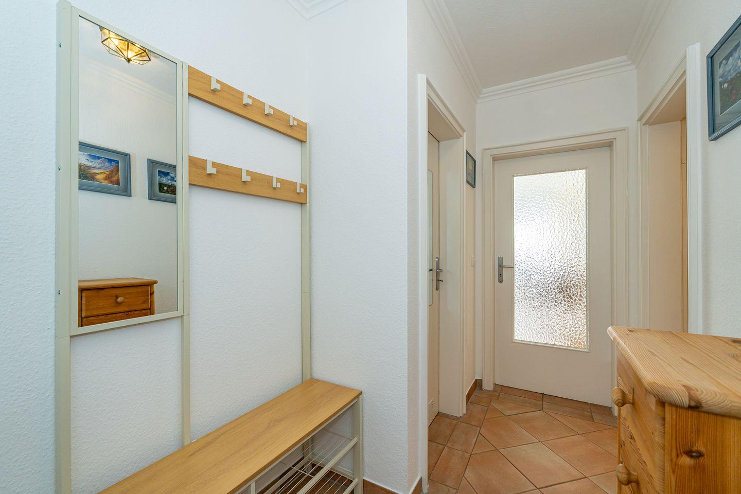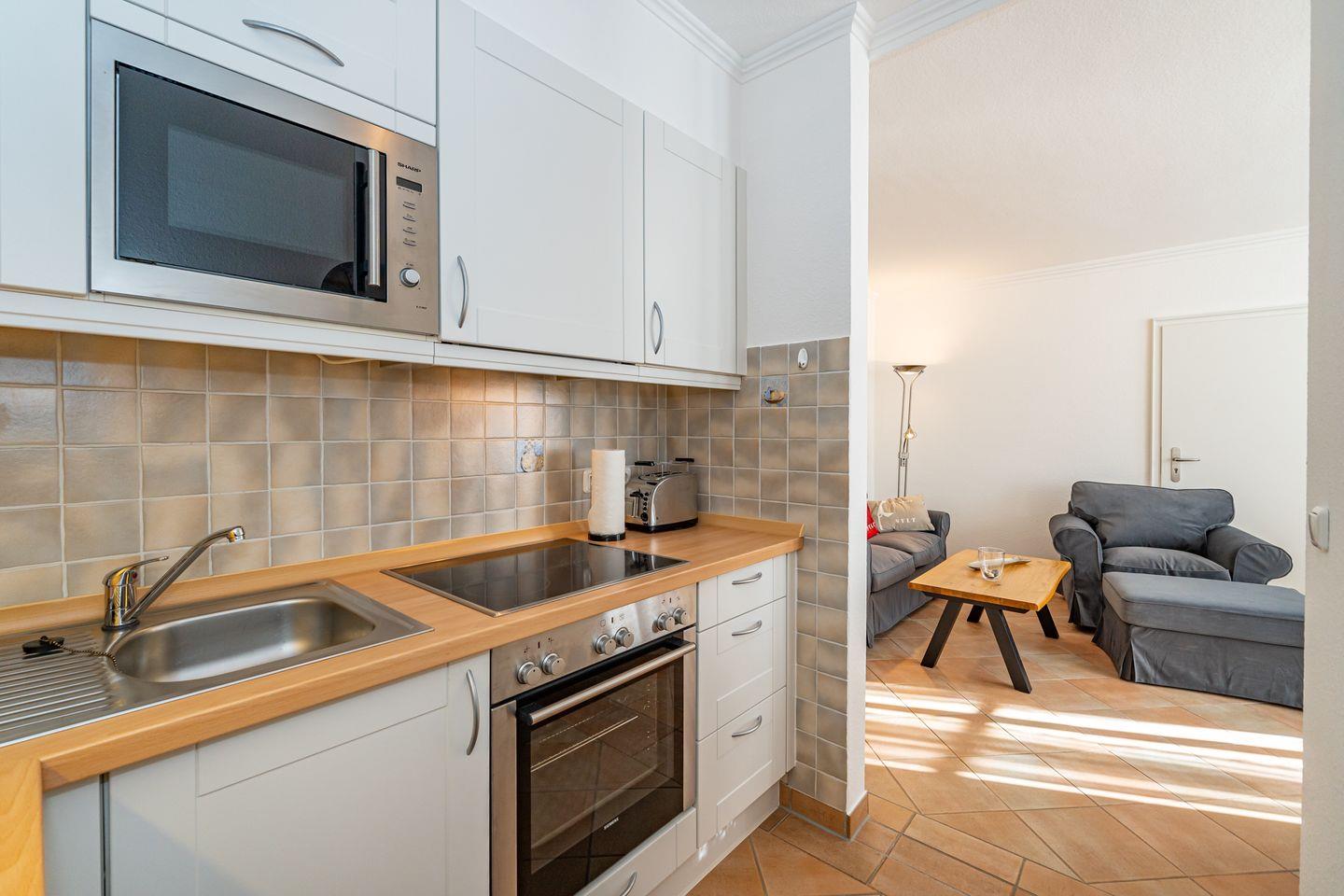 Schöne und liebevoll eingerichtete Ferienwohnung im Herzen von Westerland. Von der großzügigen Diele gelangt man in das Wohnzimmer und das moderne Duschbad. Das Wohnzimmer ist mit einem bequemen Sofa, Sessel und Couchtisch sowie Fernseher eingerichtet. Der Essplatz grenzt an die offene und komplett ausgestattete Küche. Von dem kleinen Balkon, der mit 2 Stühlen und Tischchen ausgestattet ist, hat man einen Blick Richtung Friedrichstraße . Im offenen Schlafbereich steht ein bequemes Doppelbett. Das Duschbad ist großzügig mit Ablageflächen ausgestattet. Das Appartementhaus, in dem sich diese Ferienwohnung befindet, steht an der Fußgängerzone, die in die Friedrichstr. übergeht. Das Appartement ist in der 1. Etage und ist ohne Stufen mit Fahrstuhl zu erreichen. Der Strandübergang Friedrichstraße ist fußläufig in 9 Minuten erreichbar und ca. 650 Meter entfernt. Der Bahnhof Westerlands liegt ebenfalls in unmittelbarer Nähe.