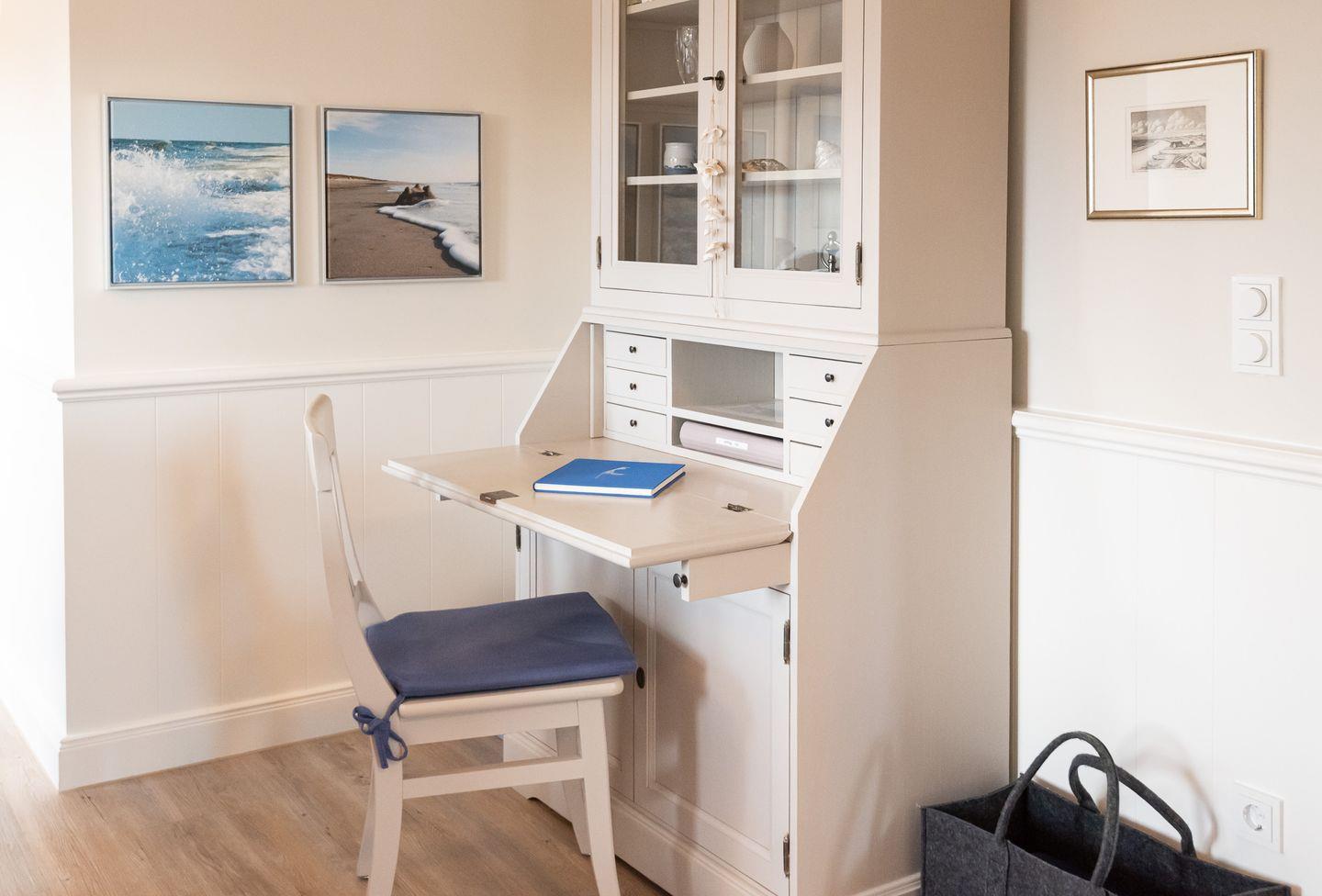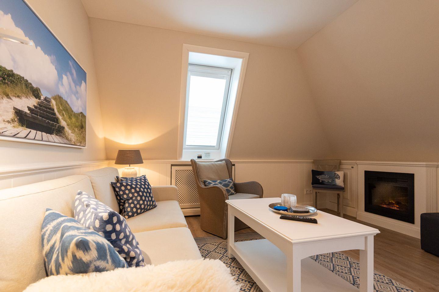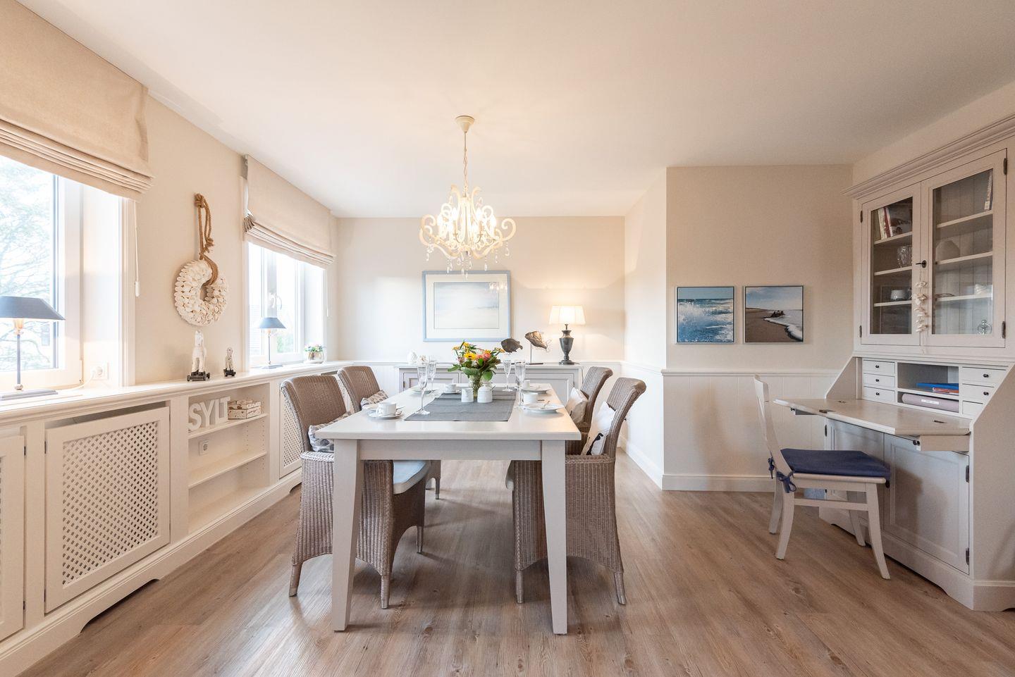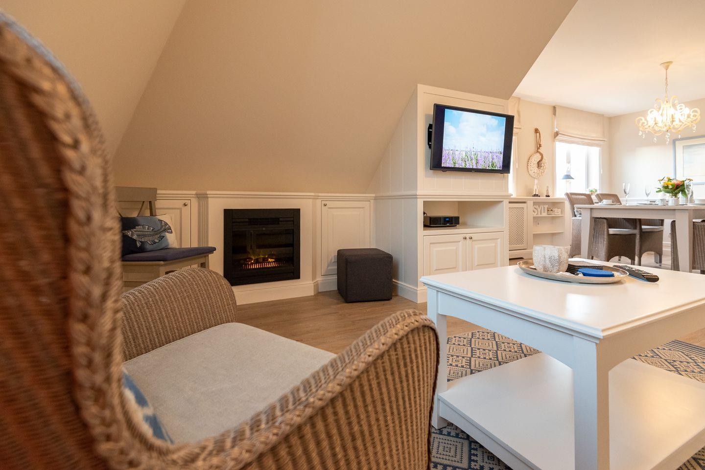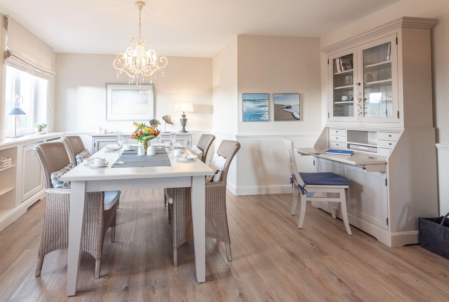 Wohn-/Essbereich: Der helle Wohnbereich überzeugt durch gemütliche Polstermöbel, Rattansessel, TV, elektrischen Kamin sowie einen kleinen Sekretär, der auch mobiles Arbeiten im Urlaub ermöglicht. Im Wohnbereich befindet sich ein großzügiger Esstisch mit Platz für 4 Personen.