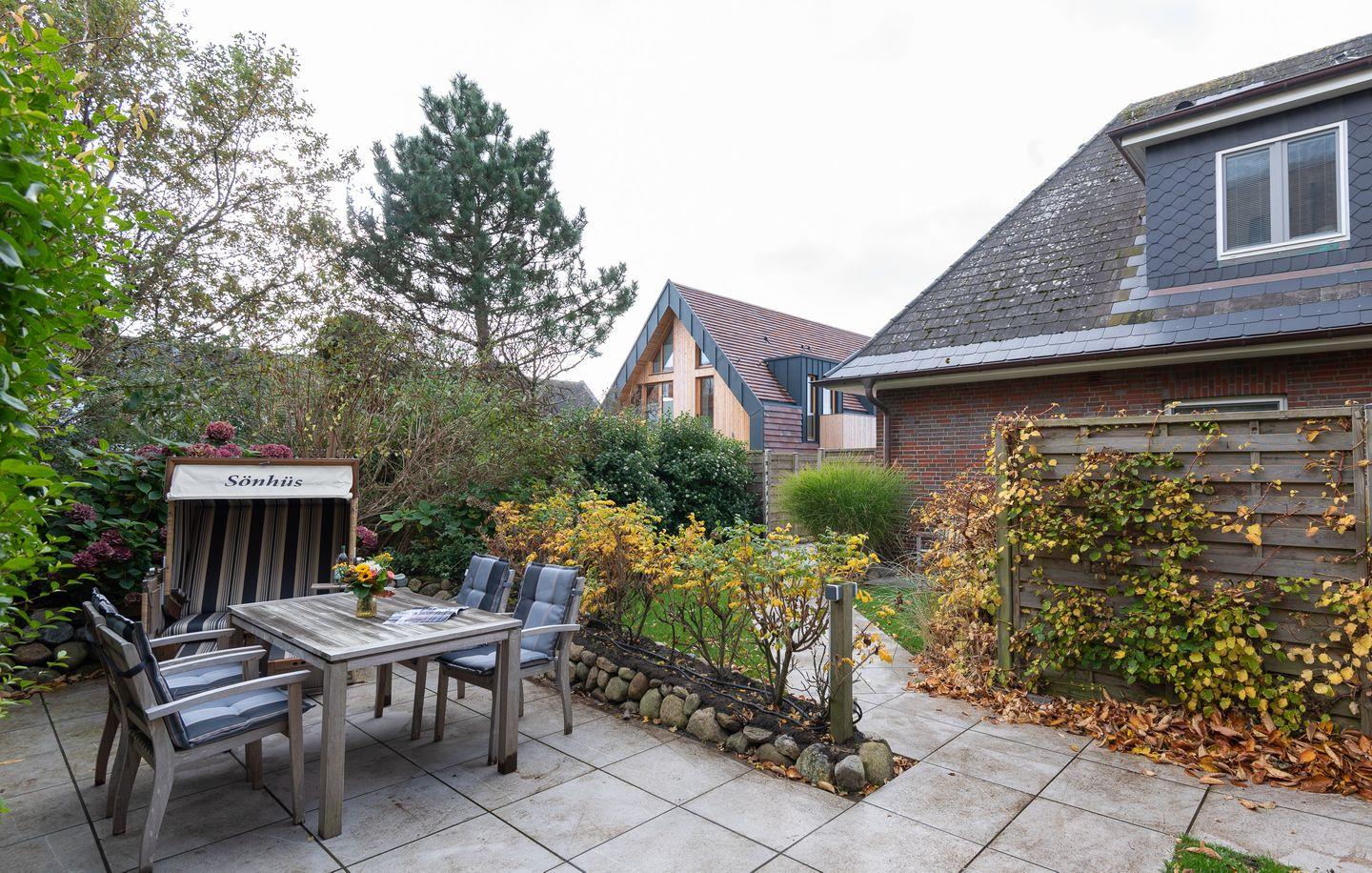 Besonderheiten: Auf dem Grundstück steht Ihnen eine eigene Terrasse mit Gartenmöbeln und Strandkorb zur Verfügung. Im Untergeschoss des Hauses befindet sich ein Waschraum mit Trockner und Waschmaschine zur kostenfreien und gemeinschaftlichen Nutzung sowie eine Sauna mit kleinem Ruhebereich und ein separates Bad. Ein eigener Fahrradschuppen auf dem Grundstück ermöglicht das sichere Abstellen Ihrer Fahrräder. Im gleichen Haus befindet sich unsere schöne Sönhüs Whg. 1 EG (69/1) für bis zu 4 Personen. Bei Interesse können beide Feriendomizile für bis zu 8 Personen in Kombination gebucht werden.