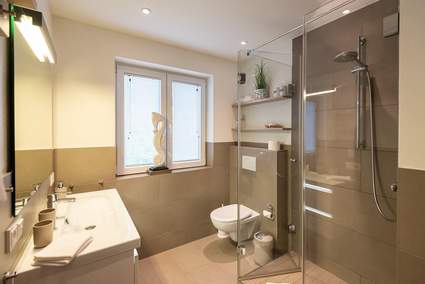 Badezimmer 1: Modernes Duschbad mit Fenster.