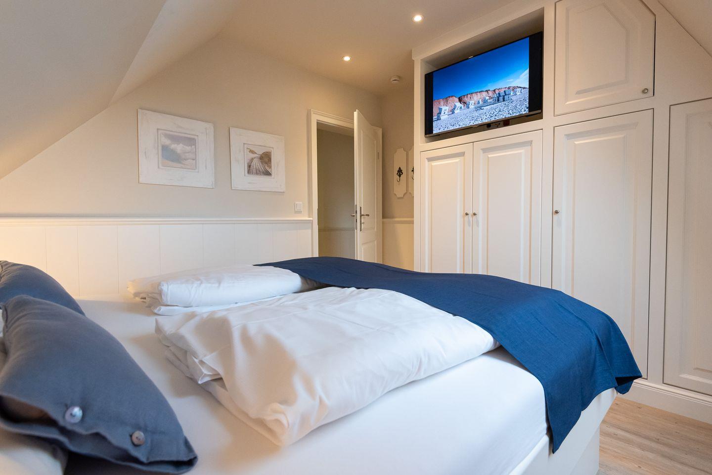 Schlafzimmer 2: Gemütliches Doppelbett, Einbauschränke und TV.