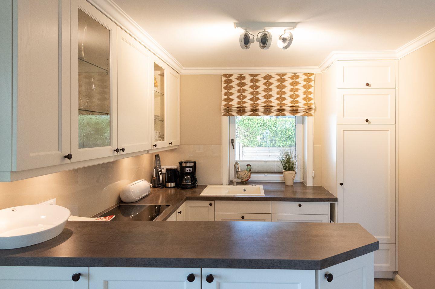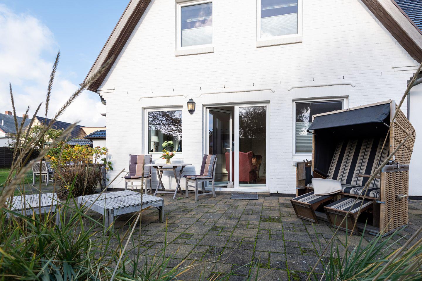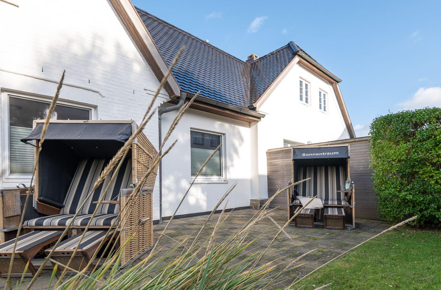 Koch-/Wohn-/Essbereich: Die gut ausgestattete Küche im Landhausstil wird von einem großzügigen Essbereich für bis zu 6 Personen vom Wohnbereich abgegrenzt. Die gemütlichen Polstermöbel im Wohnbereich laden zum Verweilen ein. Vom Wohnbereich aus haben Sie Zutritt auf die mit Gartenmöbeln möblierte West-Terrasse mit Elektrogrill und in den wunderschönen und großen, vollständig eingezäunten Garten. In Richtung Süden liegt eine weitere Terrasse mit zwei Strandkörben und Gartenliegen.