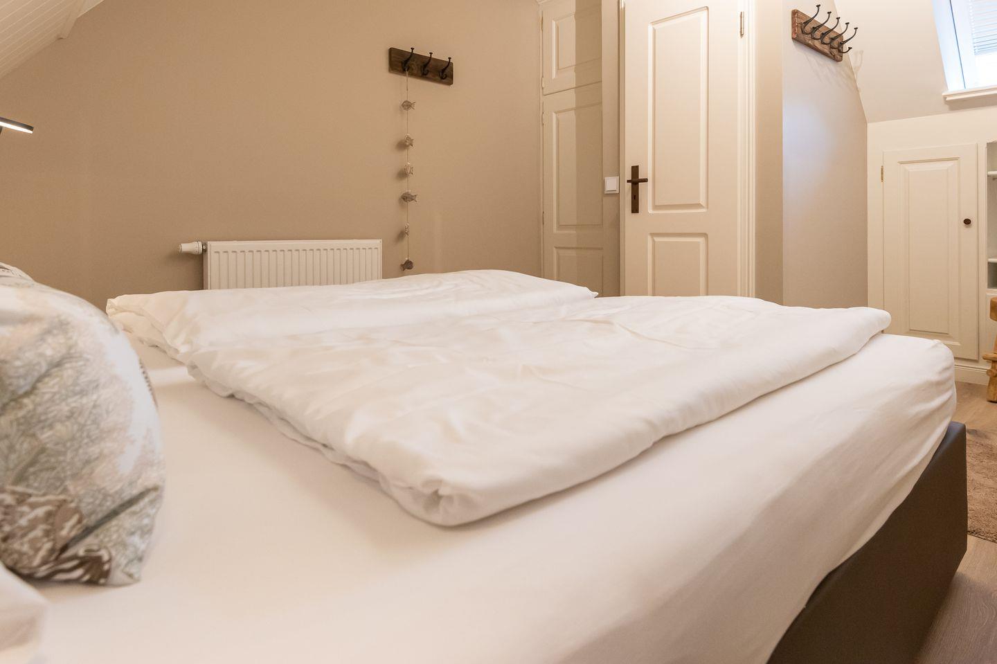 Schlafzimmer 1: Helles Doppelbettschlafzimmer mit Einbauschränken und TV.