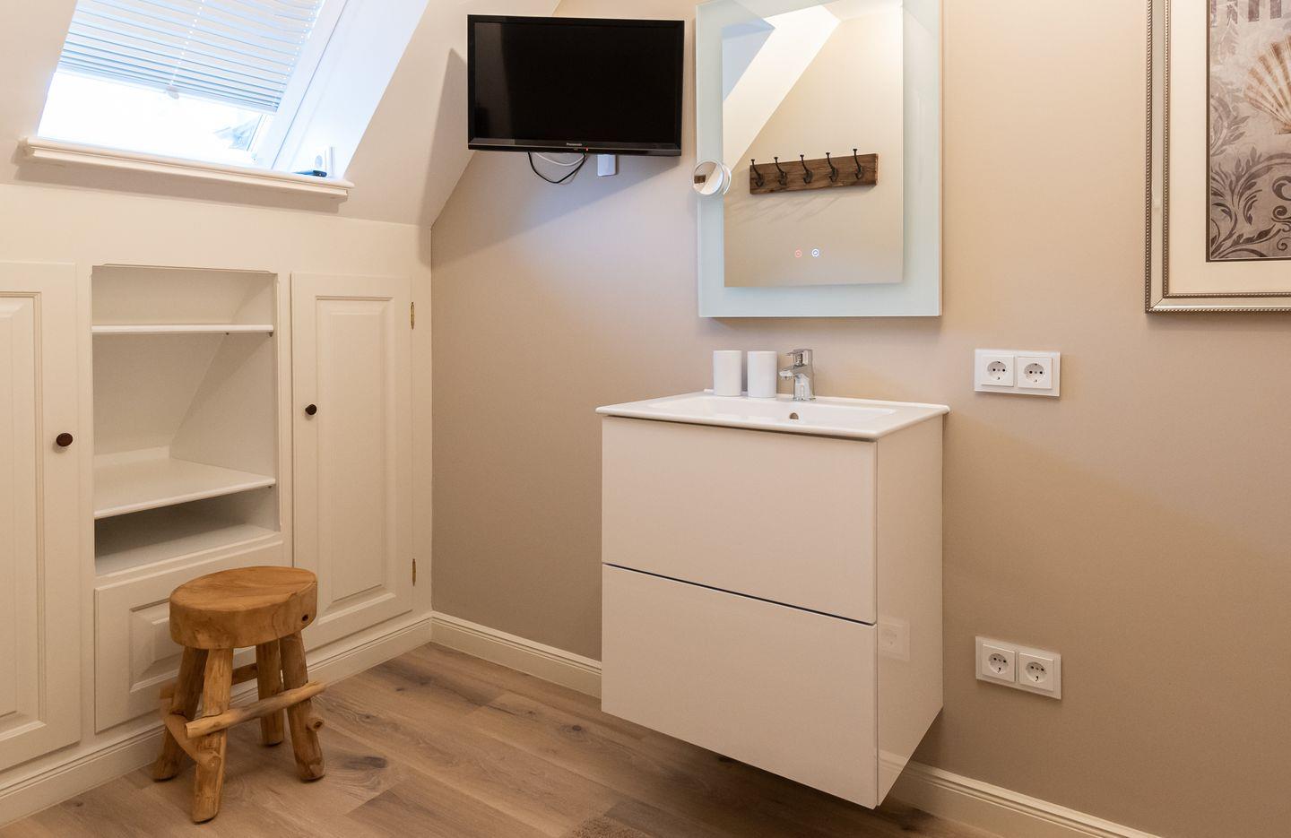 Schlafzimmer 2: Gemütliches Doppelbett, Einbauschränke, TV und Waschbecken mit Spiegel.