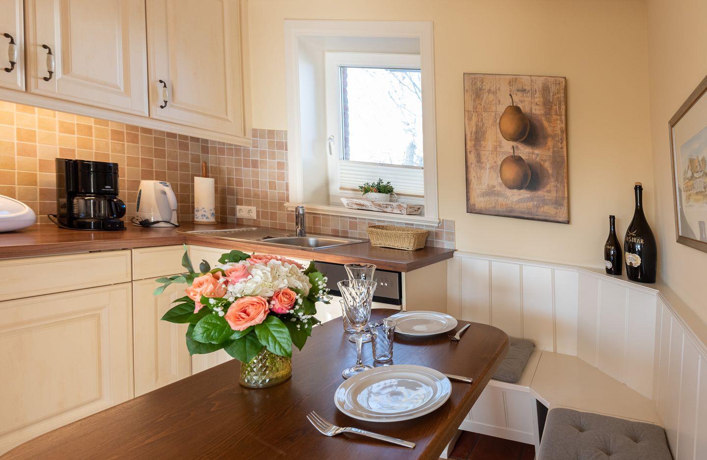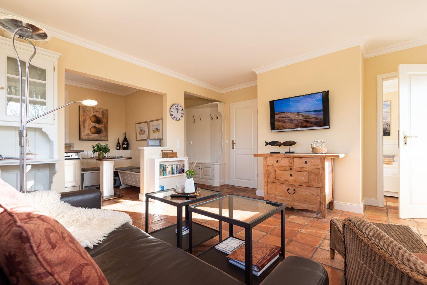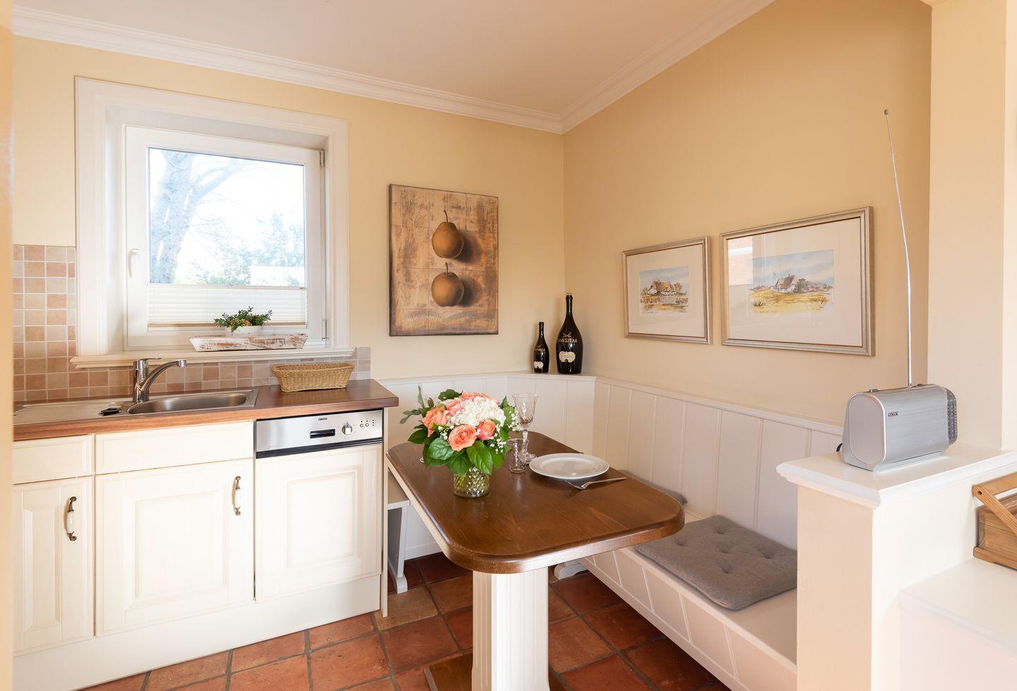 Koch-/Ess-/Wohnbereich: An die offene und gut ausgestattete Küche grenzt direkt ein Essbereich mit gemütlicher Eckbank für 2 Personen. Der helle und geräumige Wohnbereich lädt zum Verweilen ein. Ein Sekretär ermöglicht das mobile Arbeiten im Urlaub. Von hier haben Sie Zugang auf die Südterrasse mit Gartenmöbeln und Strandkorb sowie Gartennutzung.