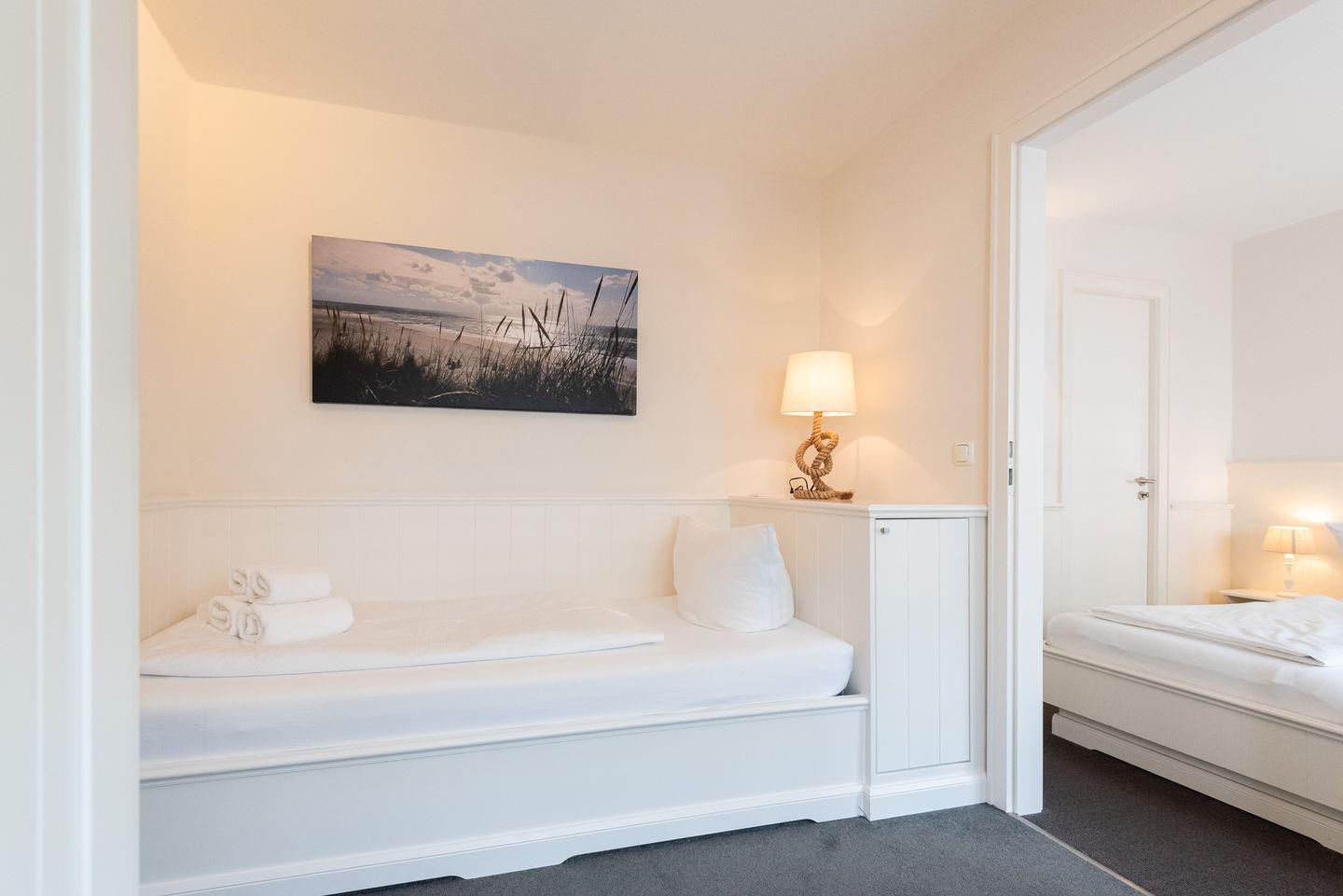 Das gemütlich eingerichtete 3-Zimmer-App. befindet sich in der 4. Etage eines gepflegten Hauses und bietet auf ca. 43 m² für bis zu drei Personen. Durch die gegenüberliegenden Häuserblöcke lässt sich vom Fenster aus ein kleiner Meerblick erhaschen ? ideal für entspannte Urlaubstage in maritimer Atmosphäre. Der zentrale Vorflur führt direkt in das helle Wohnzimmer, die separate Küche sowie in das Badezimmer mit Dusche und WC. Im Wohnbereich laden eine bequeme Sitzgarnitur (Zweisitzer), ein Sessel sowie ein Esstisch zum Verweilen ein. Für Unterhaltung sogen ein Flachbild-TV, ein Radio sowie WLAN. Die gut ausgestattete Küche verfügt über einen Geschirrspüler, einen Herd, eine Mikrowelle und einen Kühlschrank mit Gefrierfach. Eine Kaffeemaschine, ein Wasserkocher und ein Toaster gehören ebenfalls zur Grundausstattung. Beide Schlafzimmer sind vom Wohnzimmer aus zugänglich. Das erste ist mit einem Einzelbett (90x190 cm) eingerichtet, während das zweite ? dahinter liegende ? Schlafzimmer über ein Doppelbett (2x 90x200 cm), einen eigenen Flachbild-TV sowie einen begehbaren Kleiderschrank verfügt. Dieses Zimmer bietet zudem einen zweiten Zugang zum Badezimmer. Im Badezimmer finden Sie eine Dusche, ein WC sowie einen Waschtisch. Haustiere sind herzlich willkommen. Ein Fahrstuhl ist im Haus vorhanden und über eine halbe Etage zu Fuß erreichbar.