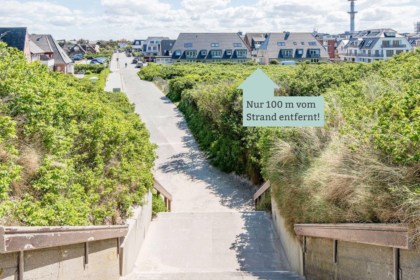 Lage: Diese Ferienwohnung liegt in ruhiger, dennoch zentraler und besonders strandnaher Lage hinter den Dünen in Westerland. Der Strandübergang "Friesische Straße" und die nach Westerland führende Promenade sind in Sichtweite und nur 100 m entfernt. Diverse Restaurants, Bars, Einkaufsmöglichkeiten und Boutiquen liegen ca. 500 m und nur 5 Gehminuten entfernt.