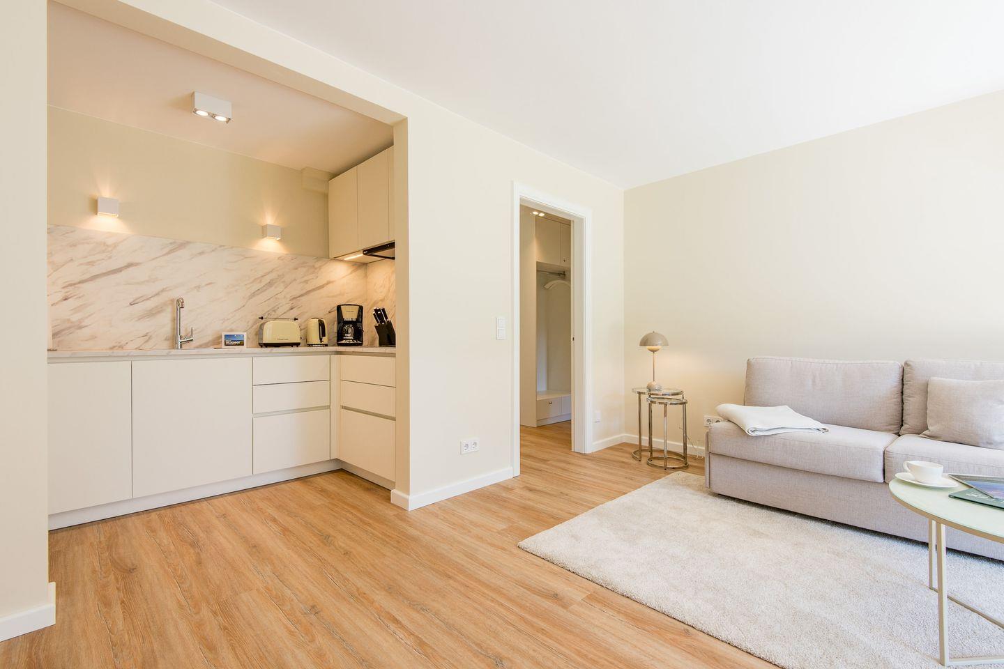 Durch eine Terrassen-Schiebetür gelangen Sie auf die möblierte Terrasse mit Saisonstrandkorb (ca. April/Mai bis Oktober) und Ost-Ausrichtung, wo Sie in der Morgensonne frühstücken können. Je nach Sonnenstand scheint die Sonne auch noch bis zum späten Mittag auf der Terrasse.