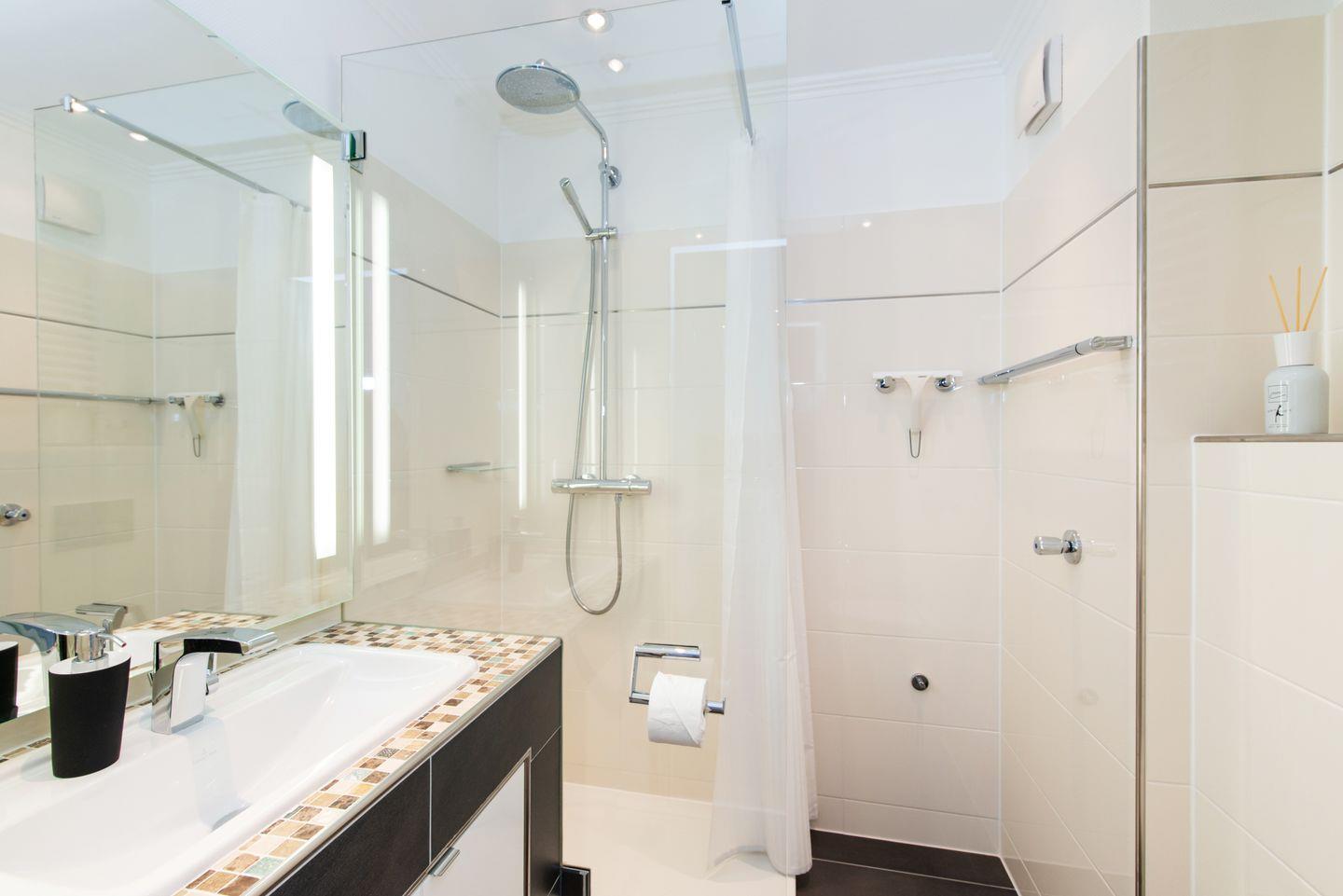 extraflachem Einstieg, Handtuchheizkörper und Duravit-WC. Im offenen Flur