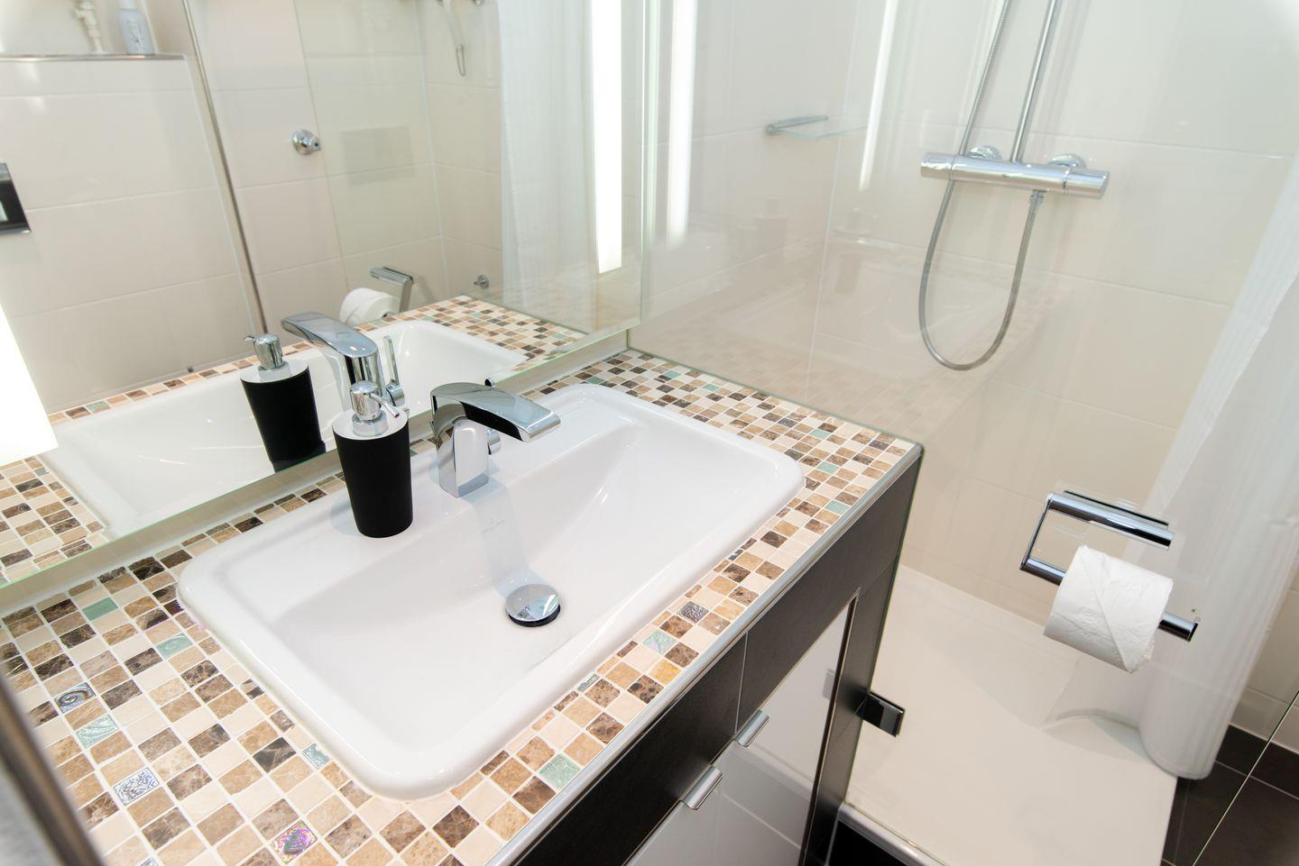 ausgestattet. Kompaktes Design-Badezimmer mit Glas-Schiebetür, beleuchtetem