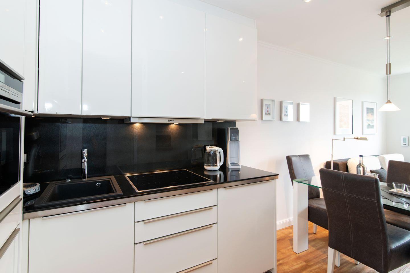 Glasrückwand, LED-Unterschrankbeleuchtung und Granit-Arbeitsplatte. Das