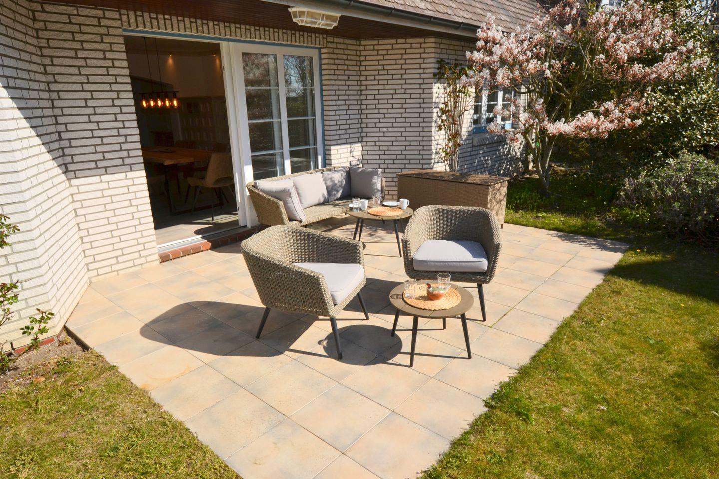 erwartet Sie eine sonnige Terrasse, auf der Sie entspannte Stunden verbringen