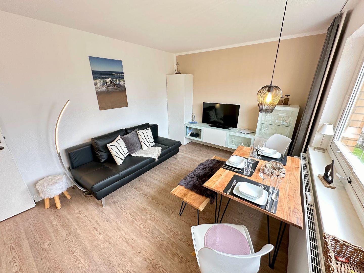 Die 2-Zimmerwohnung ist hell und gemütlich eingerichtet. Im Wohnzimmer befindet