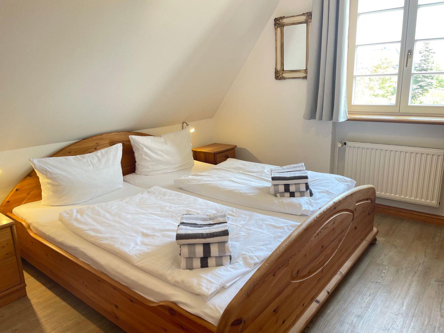 hellen Schlafzimmer mit einem gemütlichen Doppelbett (2x 90x200 cm) und