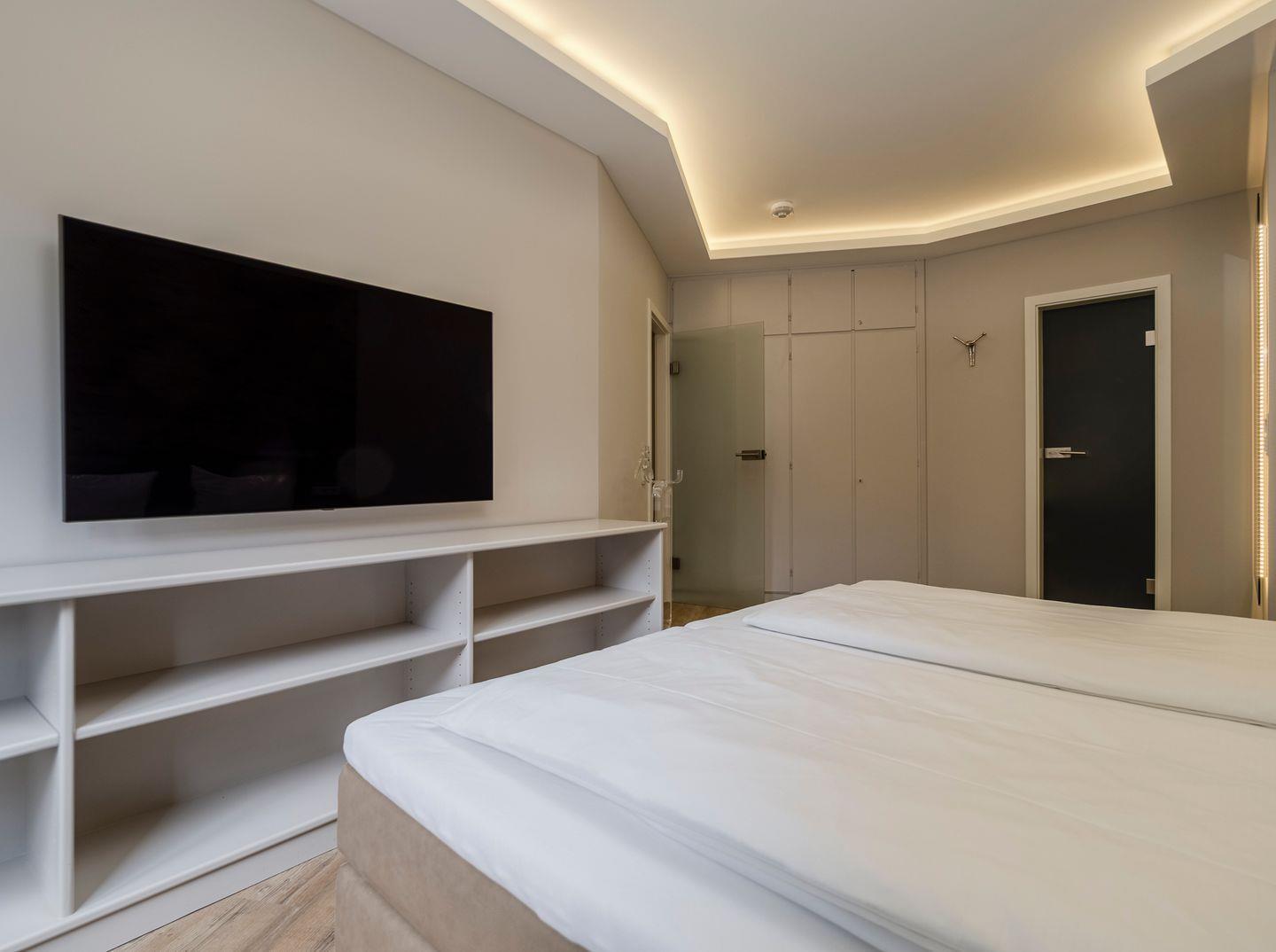 Schlafzimmer 2: Hochwertiges Schlafsofa für zwei Personen, TV und weiterem Arbeitsplatz, der das mobile Arbeiten im Urlaub ermöglicht.