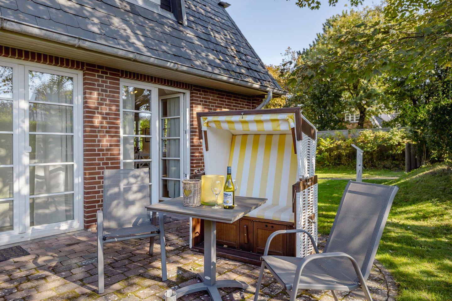 Ein besonderes Highlight ist der private Garten mit sonniger Terrasse. Ob im Strandkorb, beim Frühstück im Freien oder mit einem Buch in der Hand – hier lässt sich die Nordseeluft ganz in Ruhe genießen. Gartenmöbel und viel Grün schaffen einen geschützten Rahmen für entspannte Stunden draußen.