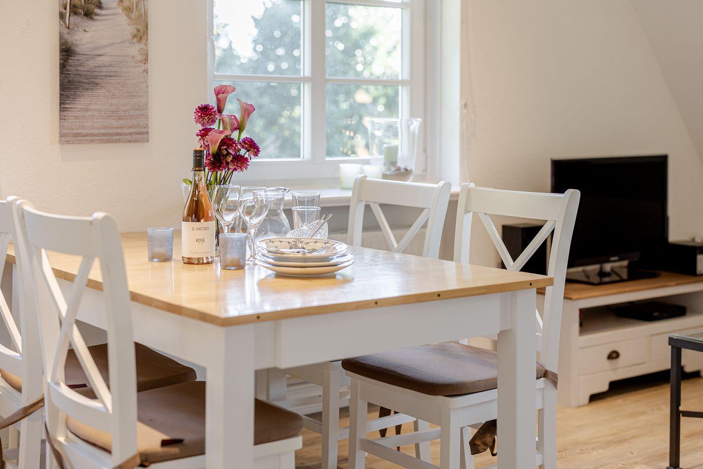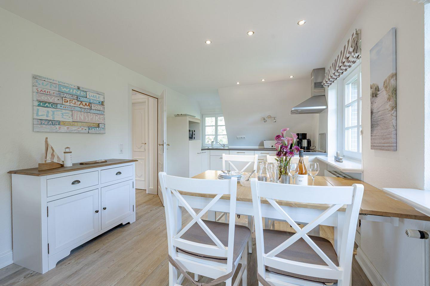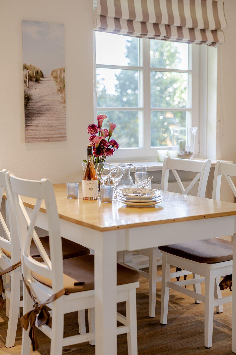 Helle Räume, natürliche Materialien und liebevolle Details prägen das Wohngefühl. Der offen gestaltete Wohnbereich mit gemütlicher Sofaecke ist ein Ort zum Zurücklehnen – nach einem Strandtag, bei einem Glas Wein oder mit einem guten Buch. Der Essplatz fügt sich selbstverständlich in den Raum ein und lädt zu gemeinsamen Mahlzeiten ein. Die moderne Küche ist vollständig ausgestattet und bietet alles, was es für eine unkomplizierte Selbstversorgung braucht.