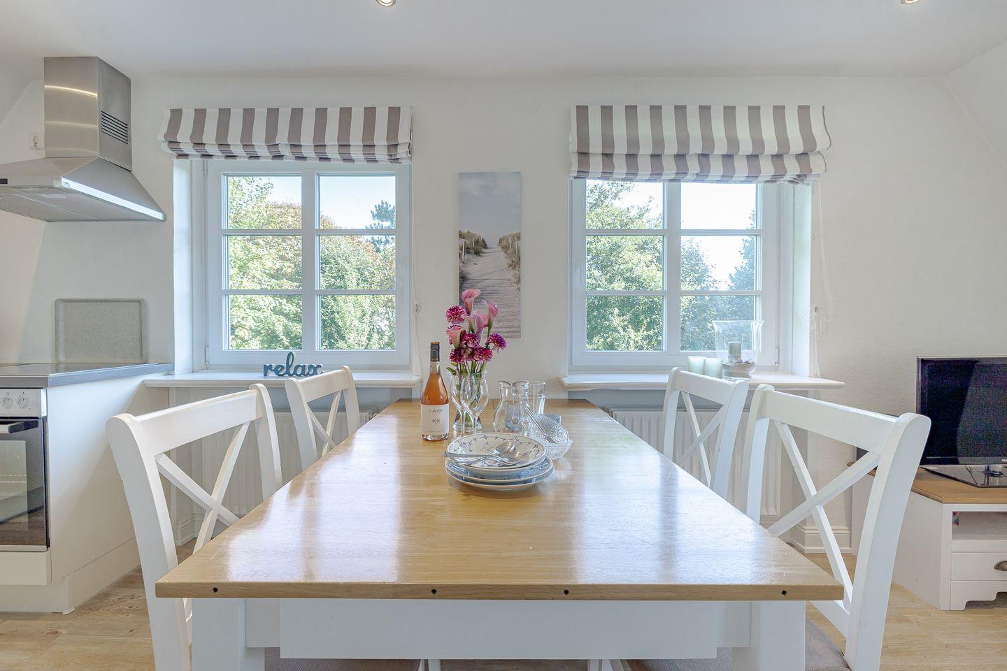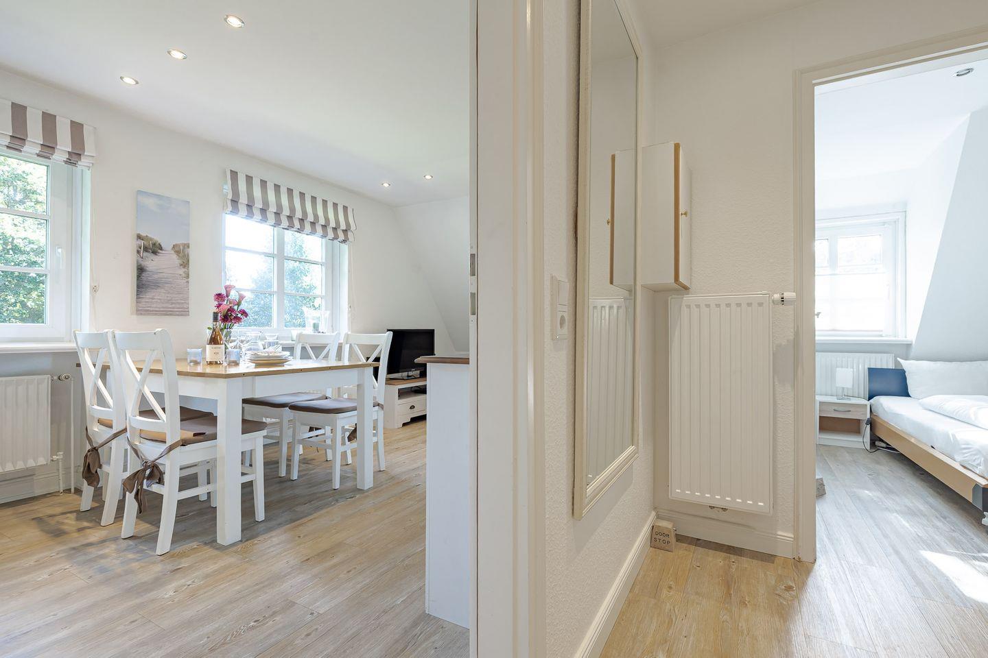 Auch die Lage ist stimmig gewählt. Der weite Weststrand ist in wenigen Minuten zu Fuß erreichbar, ebenso die ruhigere Wattseite mit ihrer besonderen Landschaft. Westerland mit Cafés, Restaurants und kleinen Läden liegt in angenehmer Nähe – nah genug für Abwechslung, weit genug für Ruhe.