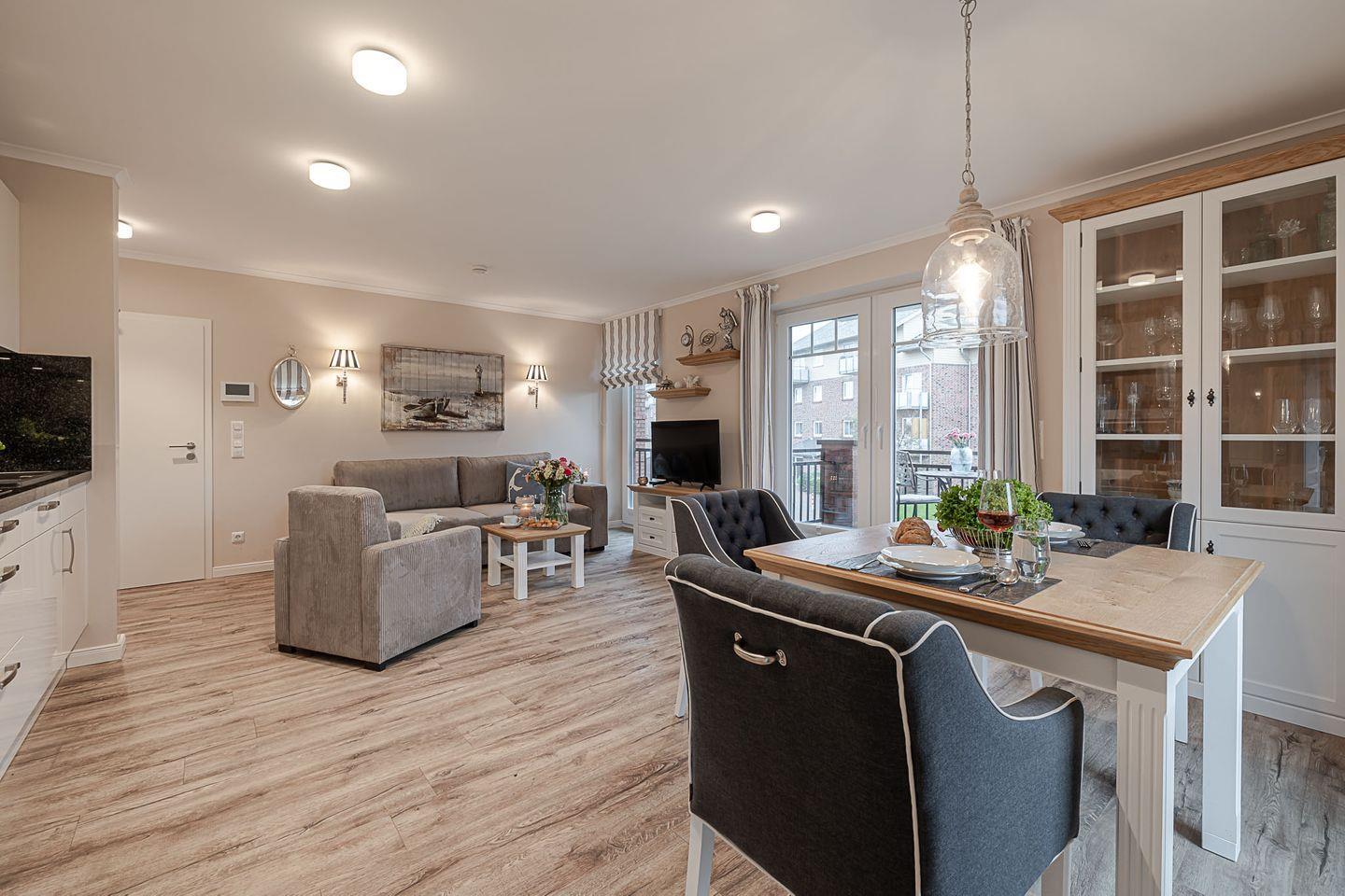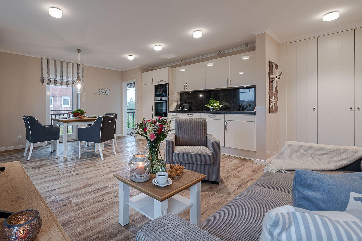Ein besonderes Highlight ist der sonnige Westbalkon, der auch bei norddeutschem Wetter durch seine geschützte Lage oft zum Verweilen im Freien einlädt – ideal, um die frische Nordseeluft zu genießen.