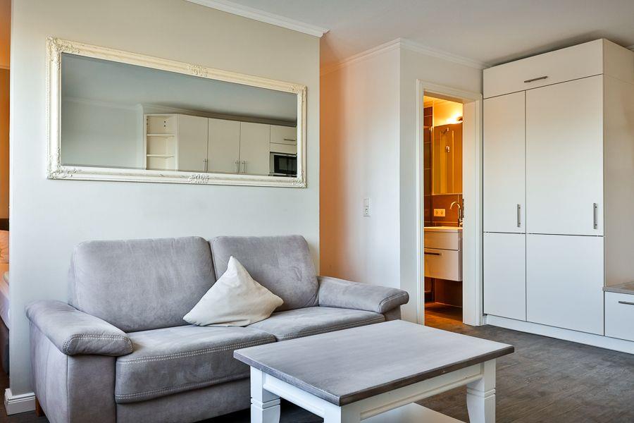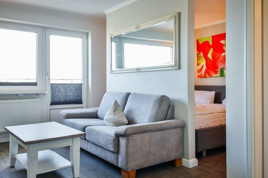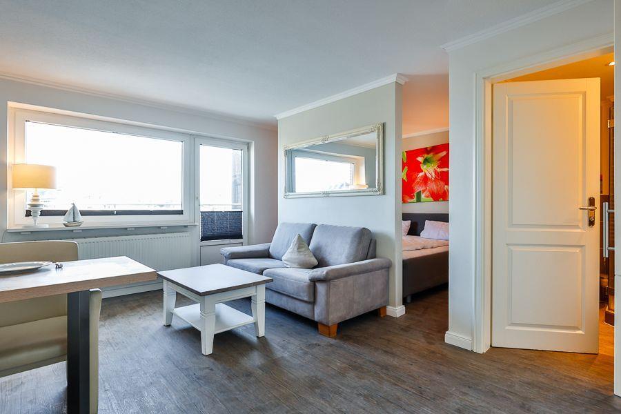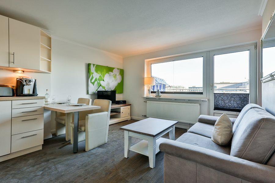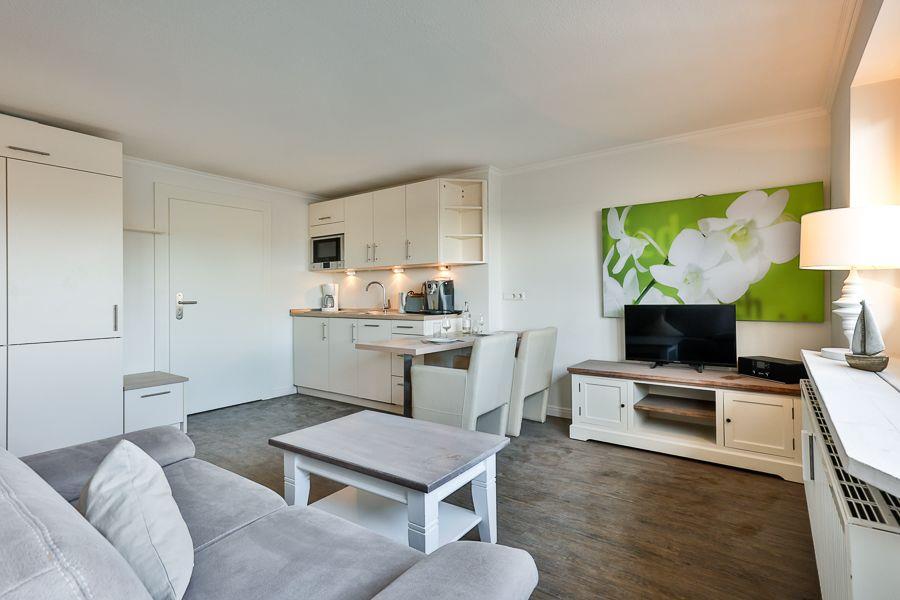 Der offene Wohn- und Schlafbereich ist modern und praktisch gestaltet und verfügt über ein bequemes Sofa sowie einen eigenen Zugang zu einem möblierten Balkon. Hier können Sie die frische Nordseeluft genießen oder in einem eigenen Strandkorb entspannen. Die offene Küche fügt sich harmonisch in das Wohnkonzept ein und ist umfassend ausgestattet: Ihnen stehen ein Kühlschrank, eine Mikrowelle, eine Spülmaschine sowie ein 2-Platten-Herd zur Verfügung. Ergänzend stehen eine Nespresso-Espressomaschine, eine klassische Kaffeemaschine, ein Wasserkocher und ein Toaster bereit. Somit sind Sie bestens ausgestattet, um sich auch im Urlaub unkompliziert selbst zu versorgen.
