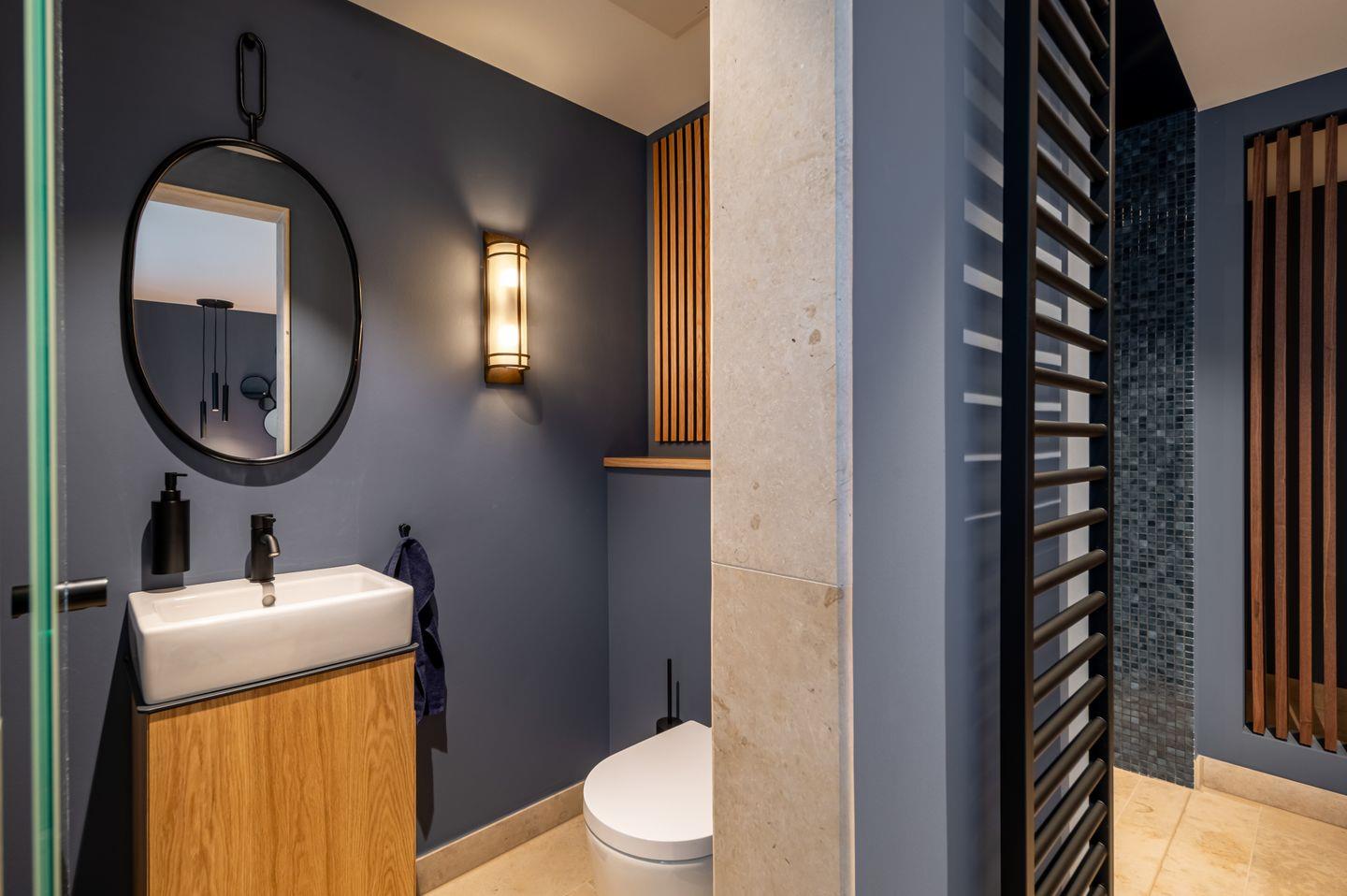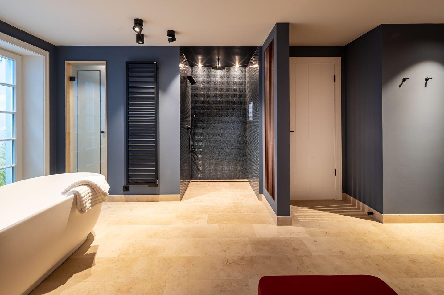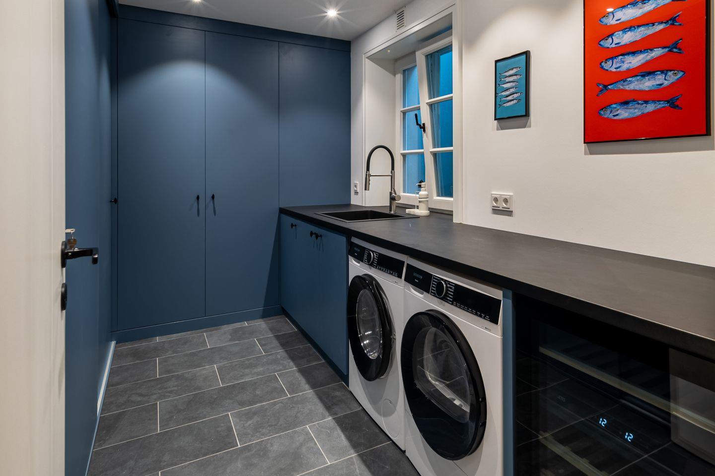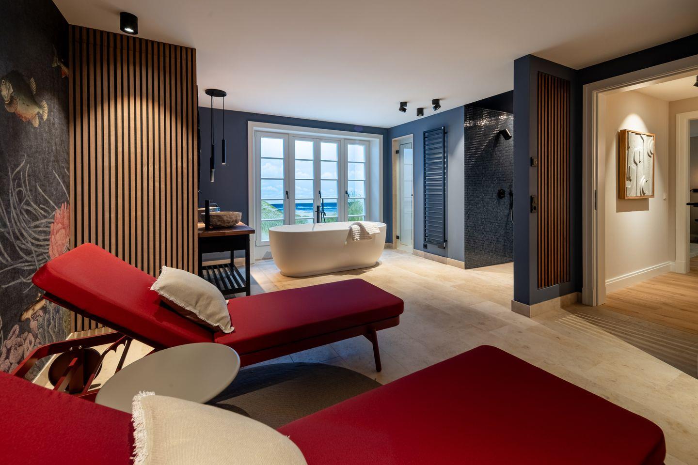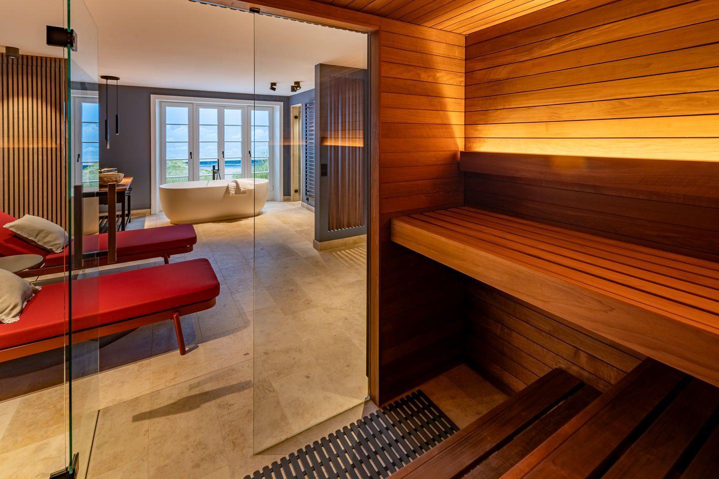 Ein privater Spa-Bereich mit Sauna, Regendusche, freistehender Badewanne und Ruhezone macht Entspannung zum Erlebnis. Ergänzend bietet ein Hauswirtschaftsraum mit Waschmaschine und Trockner praktischen Komfort.