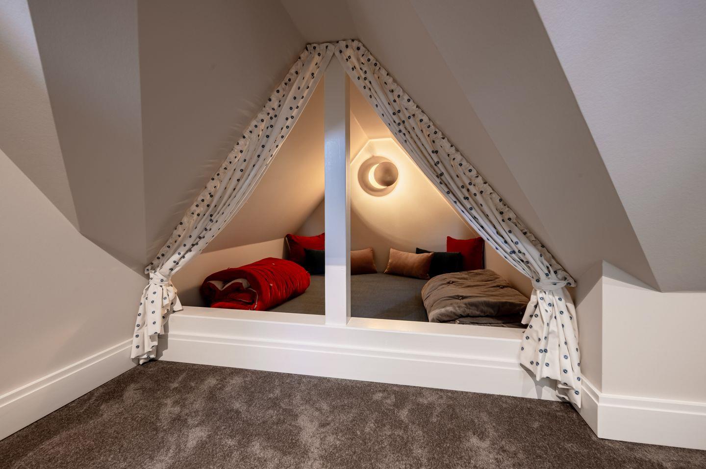 Das Obergeschoss beherbergt zwei großzügige Master-Suiten mit Bädern en Suite, ausgestattet mit Naturstein, hochwertigen Armaturen und luxuriösem Interior. Das Untergeschoss bietet ein weiteres Schlafzimmer mit Designerbad – perfekt für Gäste. Im Dachgeschoss finden Kinder ihren eigenen Rückzugsort mit Schlaf- und Spielbereich sowie separatem Bad – ein Refugium, das Familienkomfort neu interpretiert.
