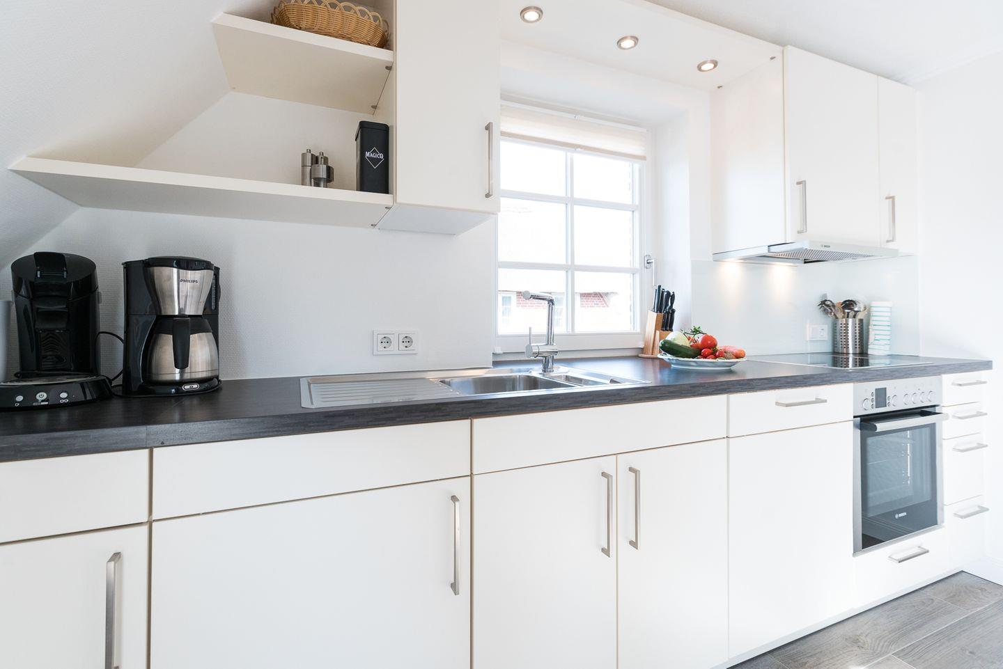 Die moderne Einrichtung, harmonische Farbgestaltung und viel Tageslicht sorgen bereits beim Betreten für eine entspannte Urlaubsatmosphäre. Der helle Wohnbereich lädt mit einer gemütlichen Couch und einem komfortablen Sessel zum Entspannen ein – perfekt nach einem langen Strandspaziergang. Direkt angrenzend befindet sich die großzügige, voll ausgestattete Küchenzeile mit Essplatz, sodass gemeinsamen Kochabenden nichts im Wege steht.