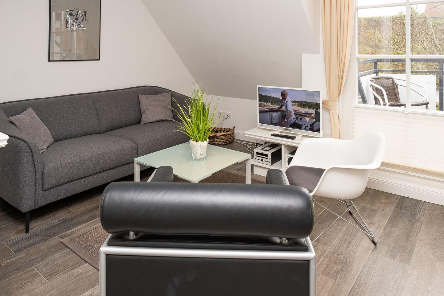 Wunderschön gelegene 3-Zimmer-Obergeschosswohnung in Westerland auf Sylt. Die moderne Einrichtung kombiniert mit gutem Farbgefühl verschafft Ihnen eine herrliche Urlaubsatmosphäre. Das lichtdurchflutete Wohnzimmer verfügt über eine bequeme Couch und einen gemütlichen Sessel. Das Schlafzimmer verfügt über ein Doppelbett. Die Wohnung ist mit einem neuen Fußboden in Holzoptik ausgestattet. Zusätzlich zum eigenen Balkon können Sie auch die Sonnenkuhle im Garten nutzen. WLAN vorhanden (ohne Gewähr)