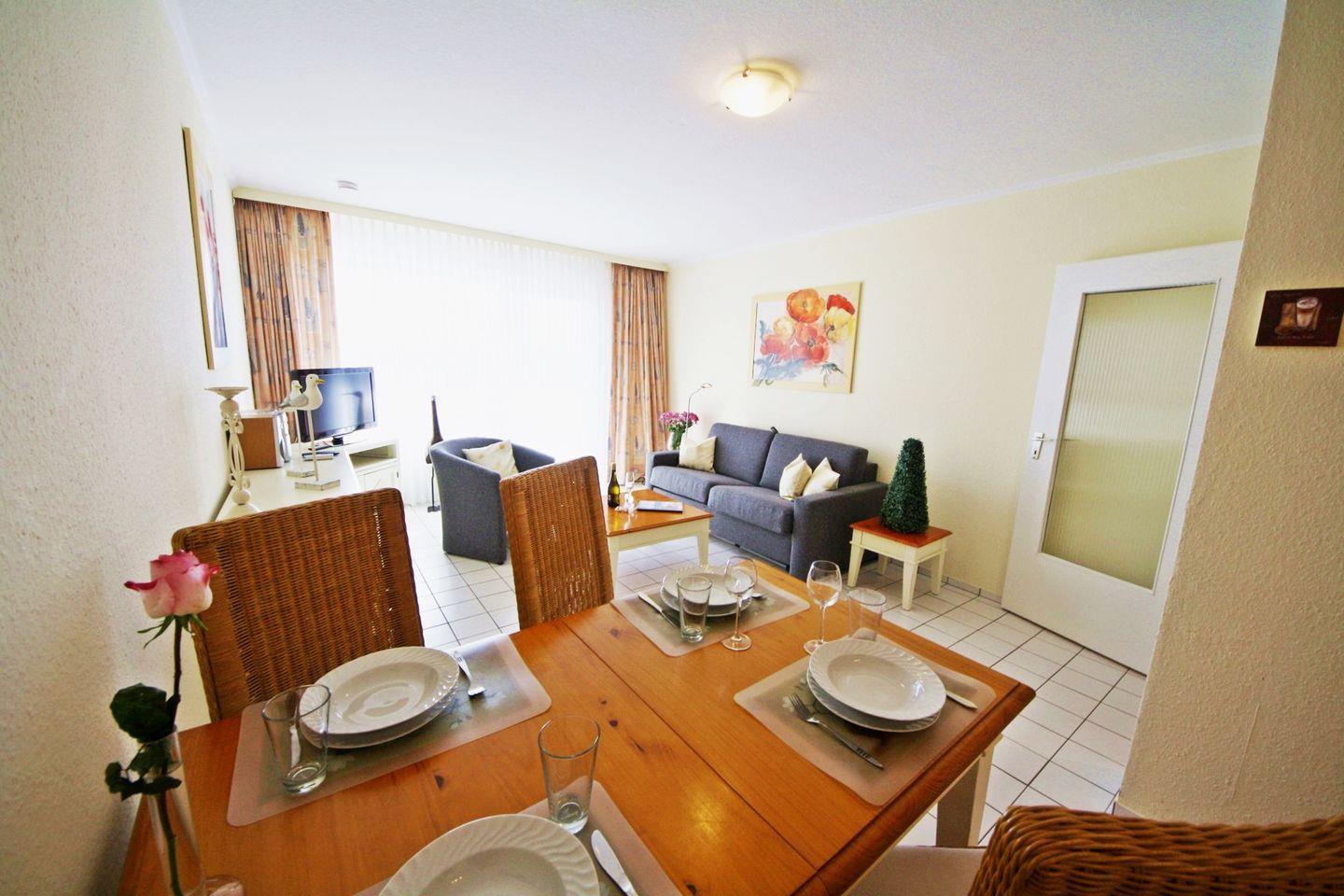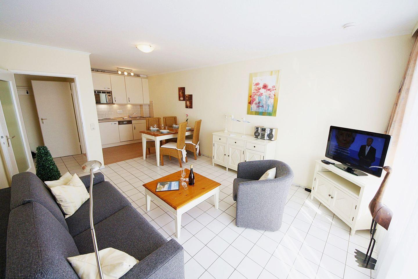 Die ca. 54?m² große 2-Zimmer-Ferienwohnung empfängt Sie mit einem offenen und freundlichen Wohn- und Essbereich. Die Einrichtung ist so gewählt, dass Sie sich vom ersten Moment an willkommen fühlen. Ein großzügiger Wohnbereich mit komfortabler Sitzecke und TV lädt zum Entspannen ein, während eine Schlafcouch zusätzlichen Schlafraum bietet – ideal für bis zu vier Personen, z.?B. Paare mit Kindern oder Freunden.