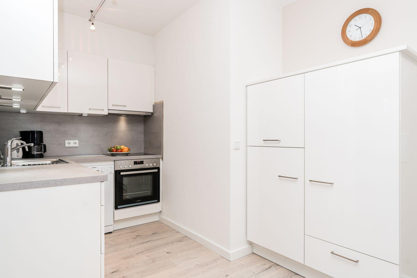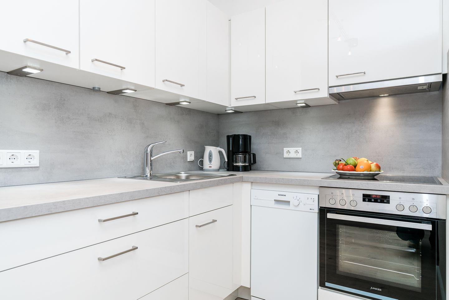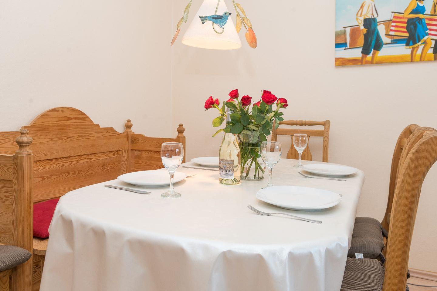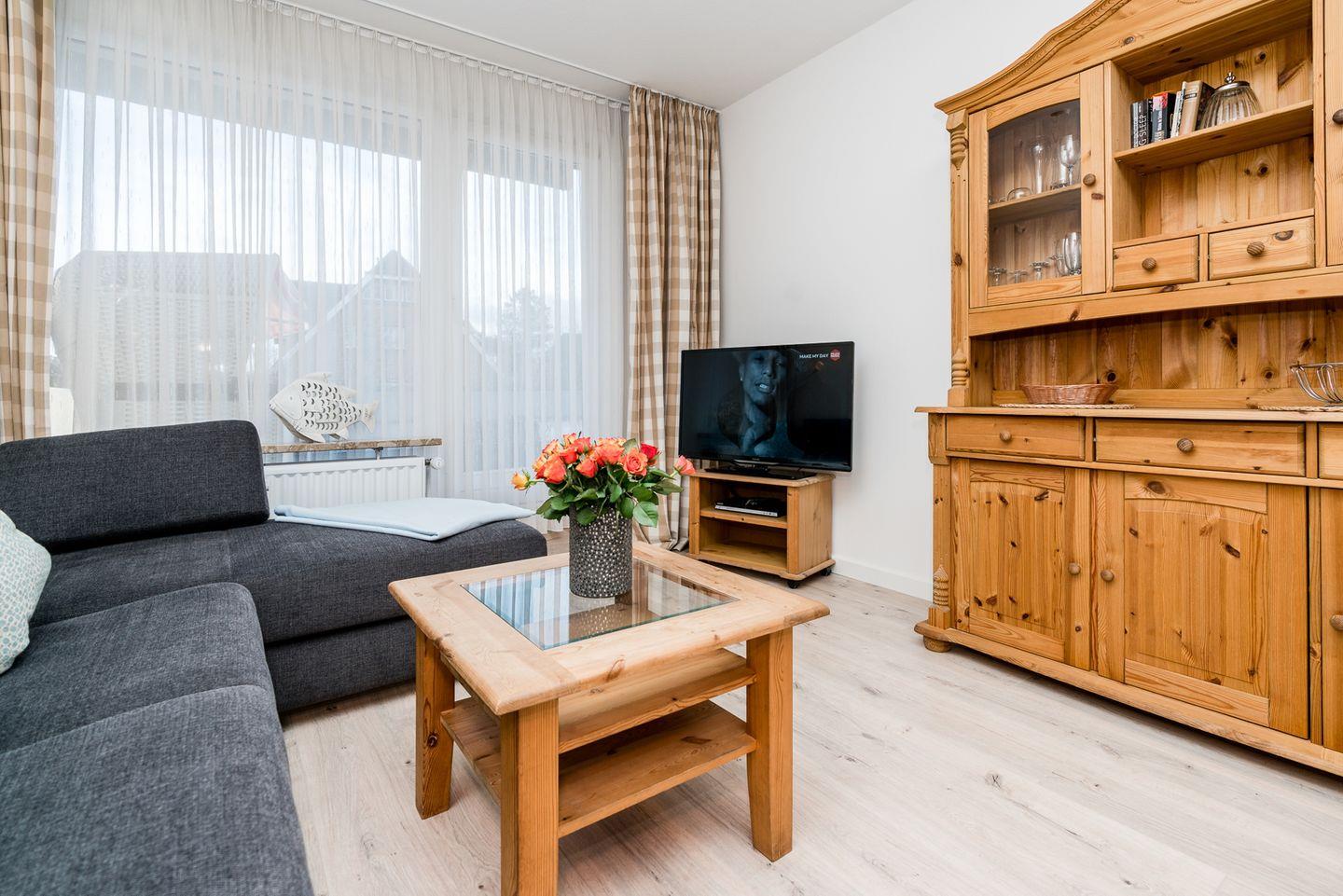 Die ca. 52 m² große 2,5-Zimmer-Ferienwohnung befindet sich im Erdgeschoss der Anlage und bietet Platz für bis zu vier Personen. Der helle Wohnbereich ist mit einer gemütlichen Sofaecke und einem großzügigen Essplatz ausgestattet und lädt zu entspannten Abenden nach einem erlebnisreichen Tag auf der Insel ein. Direkt angrenzend befindet sich die moderne Küchenzeile, die alles bietet, was Sie für die Selbstverpflegung im Urlaub benötigen.