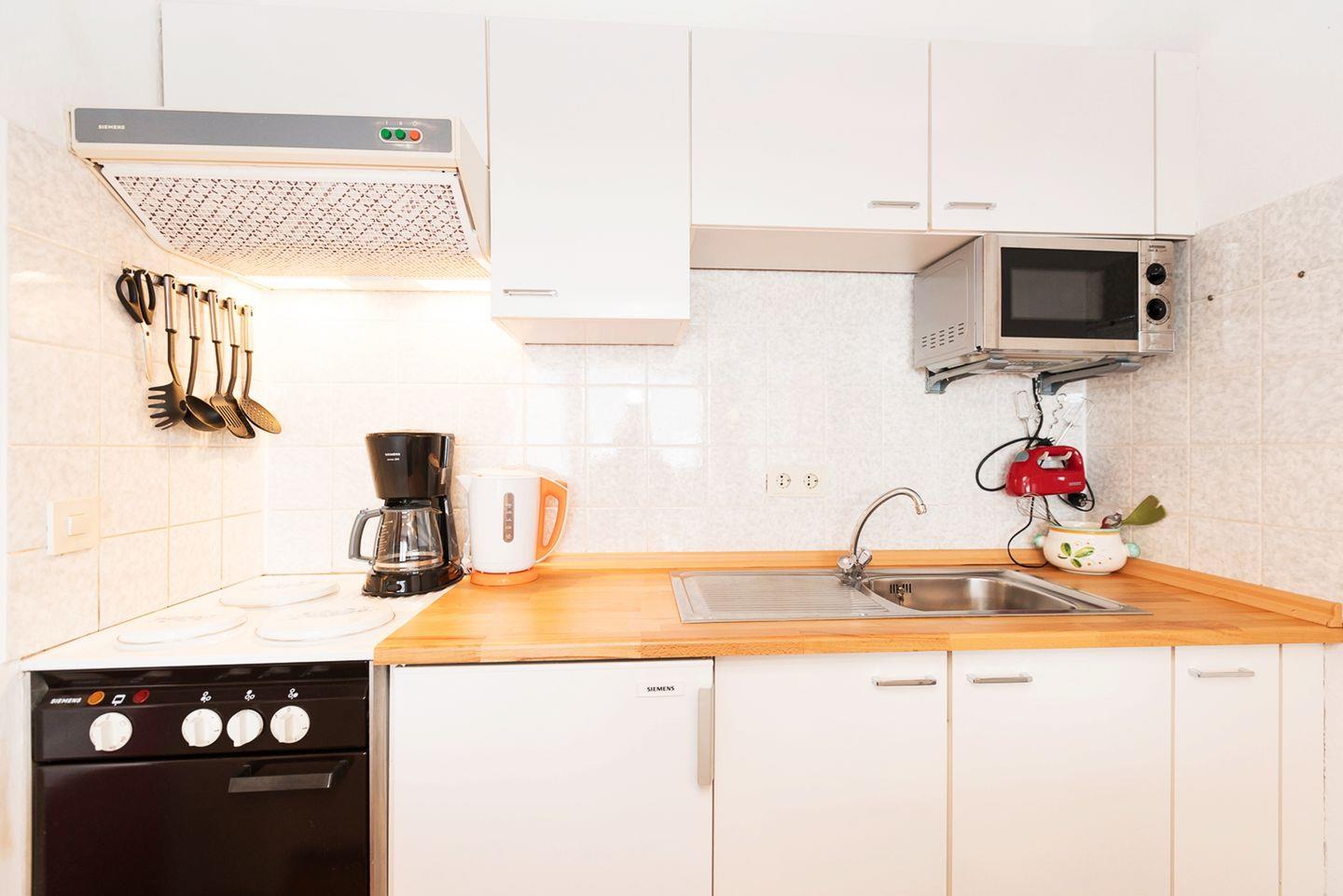 Die Küchenzeile ist funktional ausgestattet und bietet Ihnen alles, was Sie für die Selbstverpflegung im Urlaub benötigen – einschließlich Geschirrspüler, Herd, Kaffeemaschine und weiteren Küchenutensilien. Das Badezimmer mit Dusche und WC rundet das praktische Raumangebot ab.