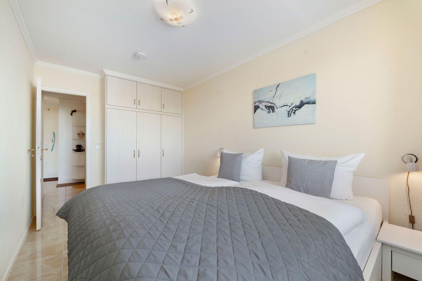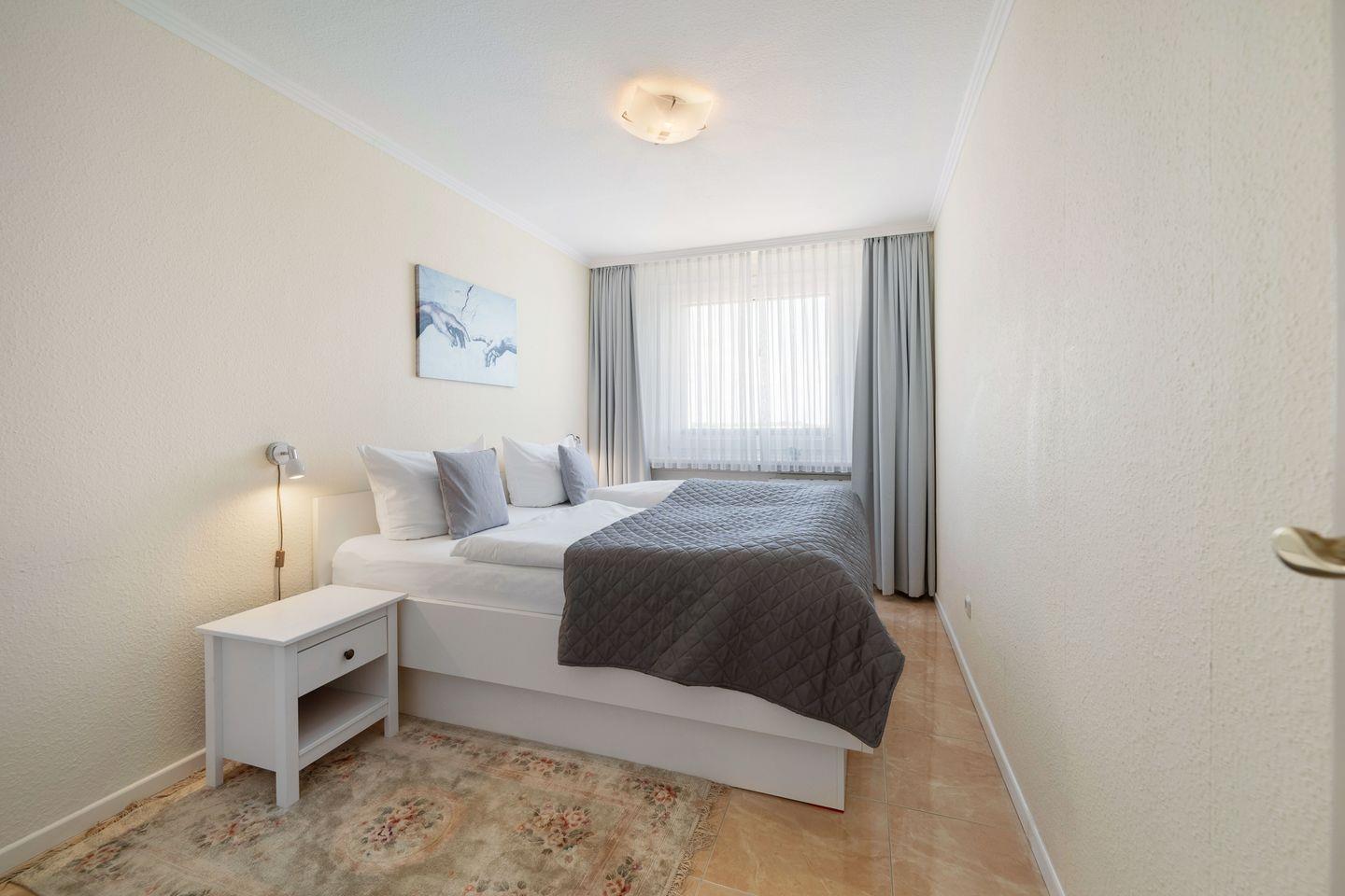 Das Schlafzimmer verfügt über ein komfortables Doppelbett und bietet einen ruhigen Rückzugsort nach einem erlebnisreichen Tag auf Sylt.
