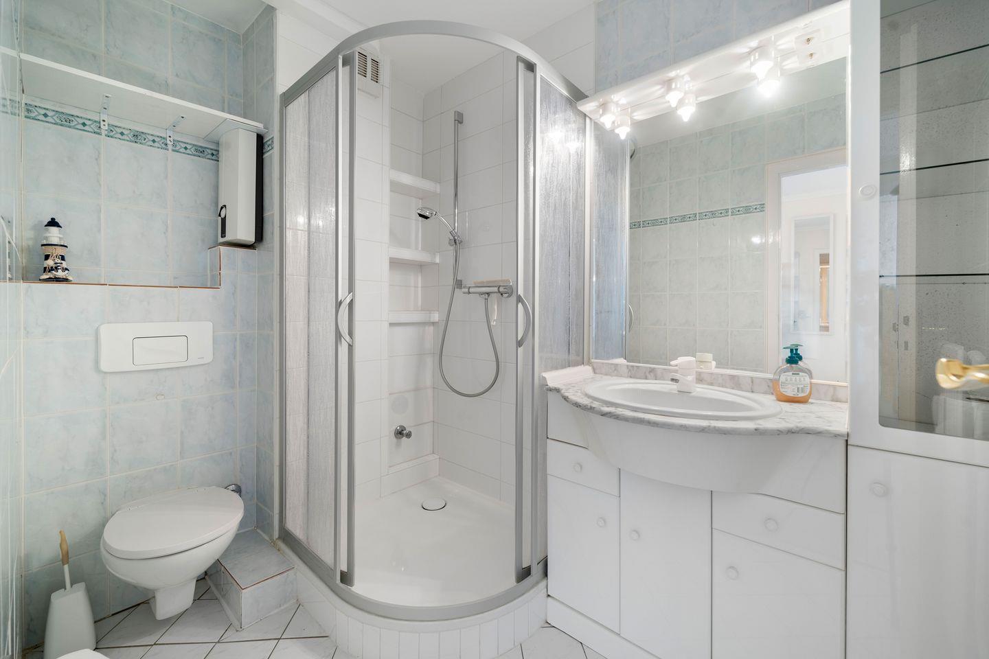 Das Badezimmer ist mit Dusche und WC ausgestattet.