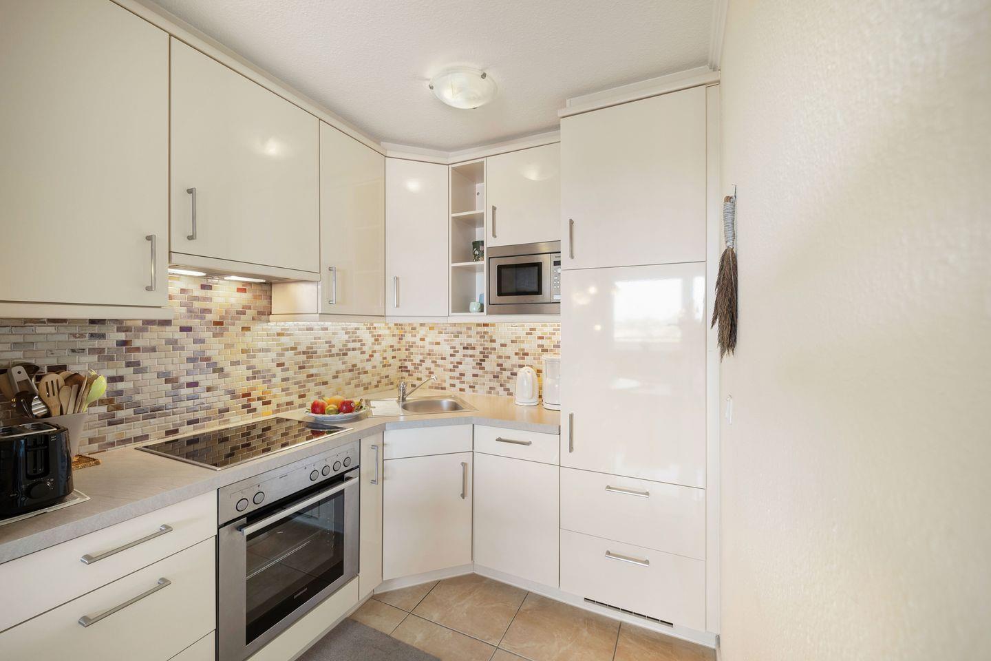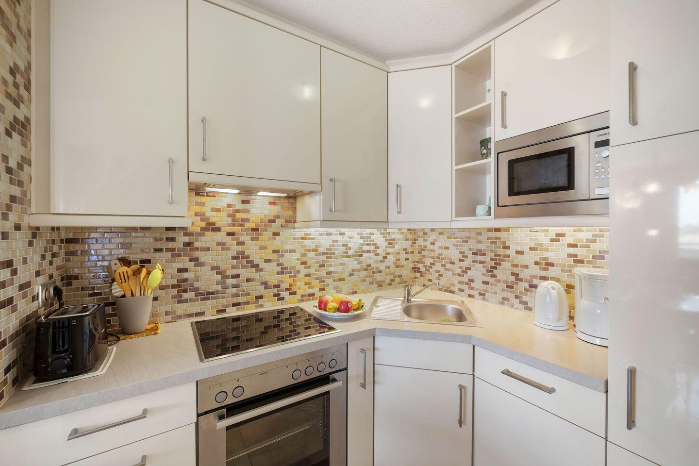 Die moderne Küchenzeile mit angrenzendem Essplatz ist bestens ausgestattet und verfügt über einen Geschirrspüler, Backofen, Mikrowelle, Kaffeemaschine, Toaster sowie einen Wasserkocher.
