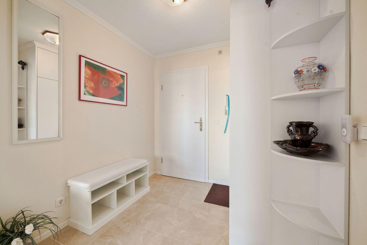 Die Wohnung liegt im 5. Obergeschoss, ist durch den Fahrtsuhl bequem zu erreichen und verfügt über einen nach Osten ausgerichteten Balkon mit Balkonmöbeln – perfekt für ein Frühstück in der Morgensonne.