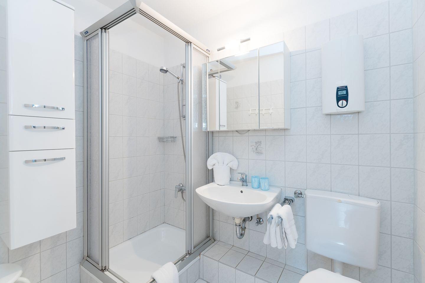 Das Badezimmer verfügt über Dusche/WC.