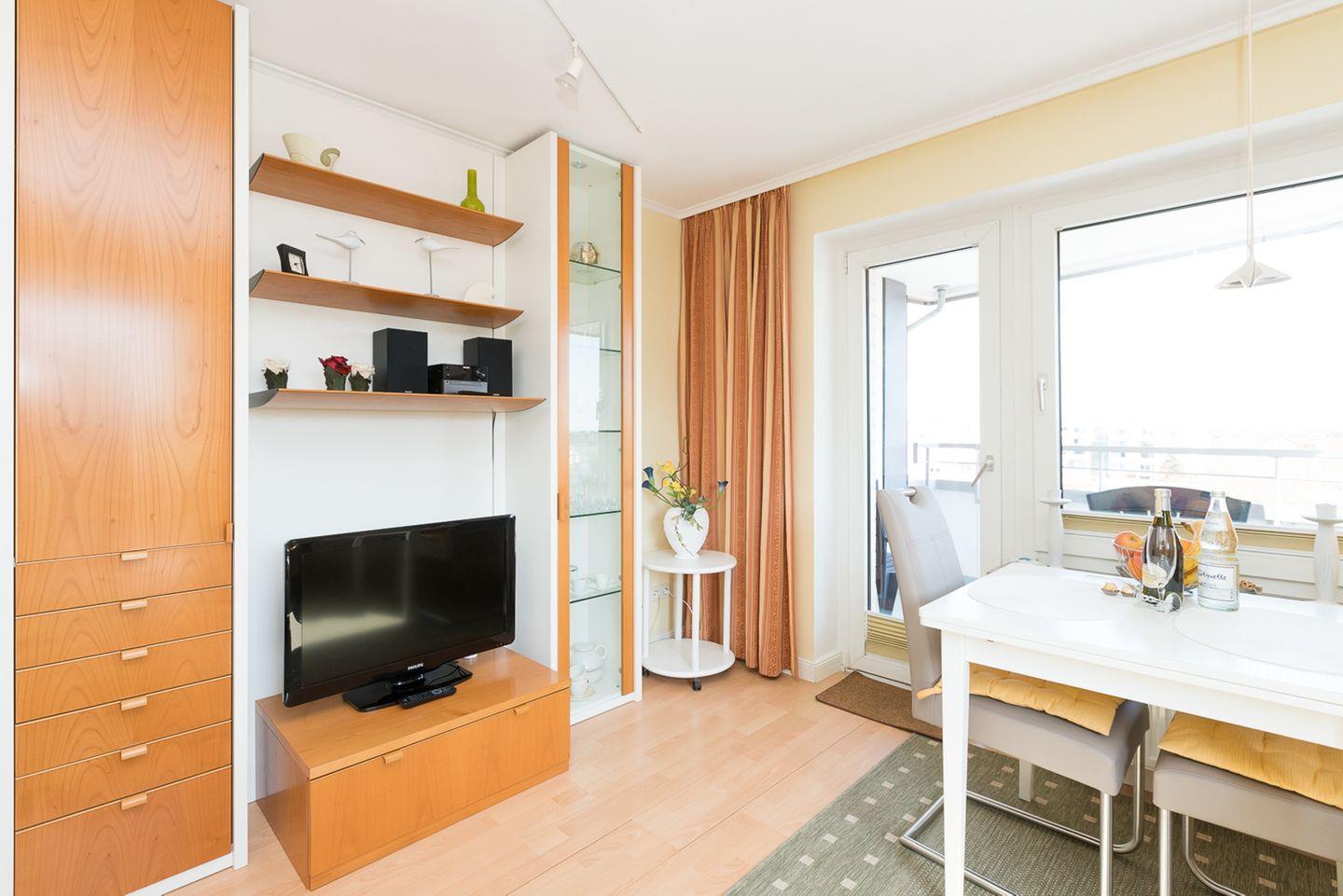Helles, lichtdurchflutetes Wohnzimmer mit sehr bequemer, neuer Schlafcouch, Essecke und anschließendem Balkon nach Südosten. Die besondere Helligkeit der Wohnung ergibt sich durch das zusätzliche Fenster im Wohnzimmer und dem zusätzlichen Fenster in der Küche, da es sich um eine Eckwohnung handelt.