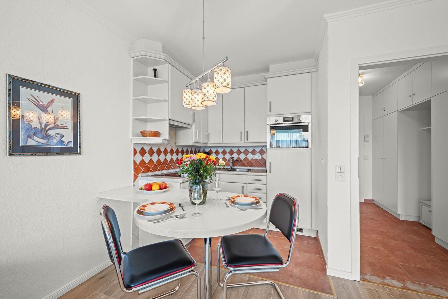 Die offene, gut ausgestattete Küchenzeile ermöglicht eine unkomplizierte Selbstverpflegung während Ihres Aufenthalts. Direkt vom Wohnbereich gelangen Sie auf den möblierten Ostbalkon, der herrlich sonnige Stunden am Morgen bereithält – perfekt für das Frühstück im Freien oder den ersten Kaffee des Tages.