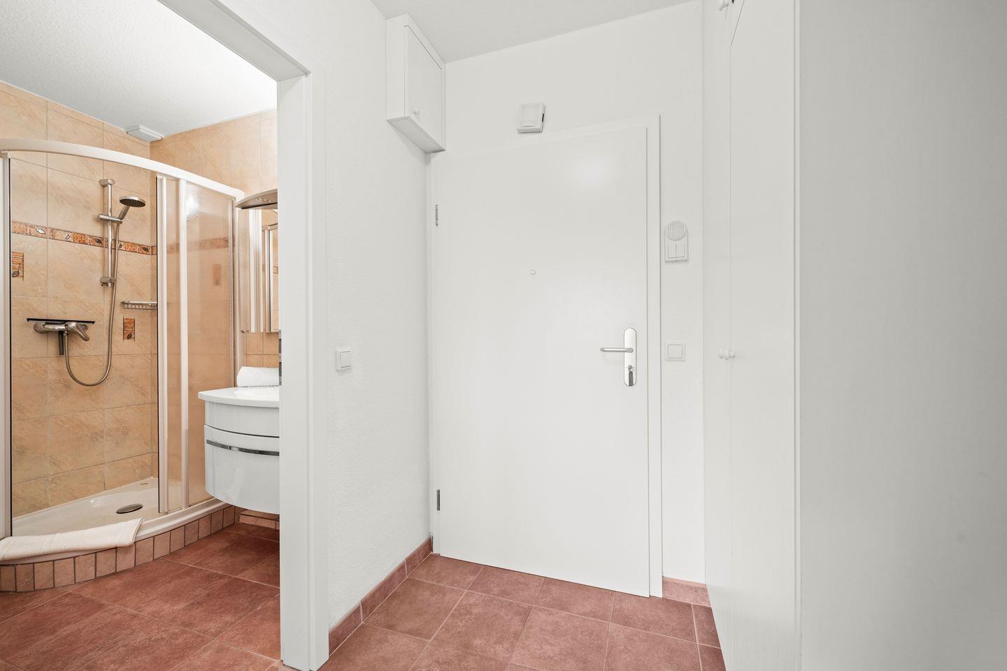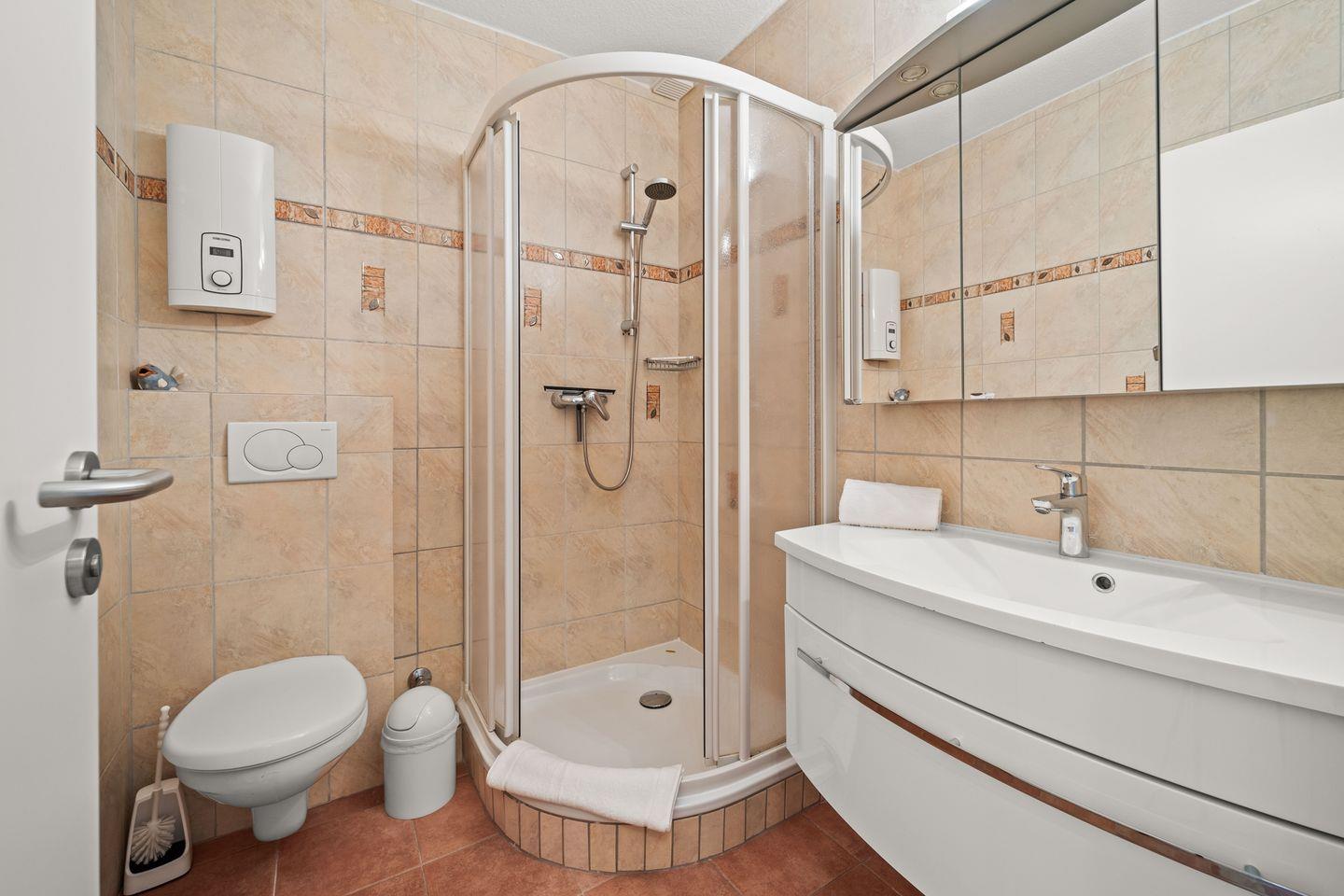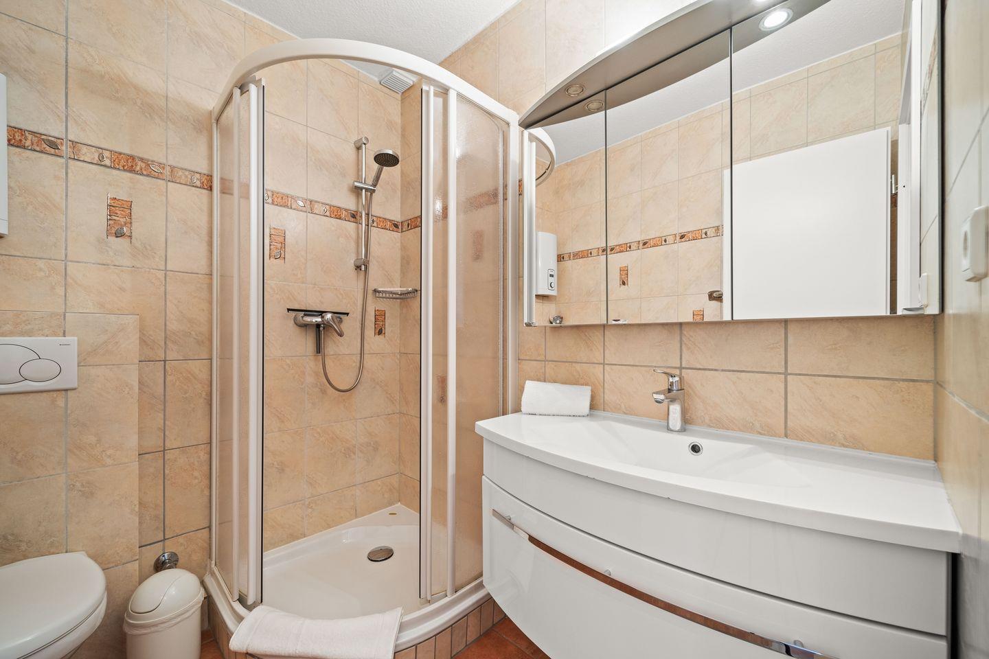 Die Wohnung verfügt über ein separates Schlafzimmer mit Doppelbett und eine Schlafcouch im Wohnbereich, sodass hier bis zu drei Personen komfortabel übernachten können. Ein modernes Badezimmer mit Dusche und WC rundet das wohnliche Konzept ab.