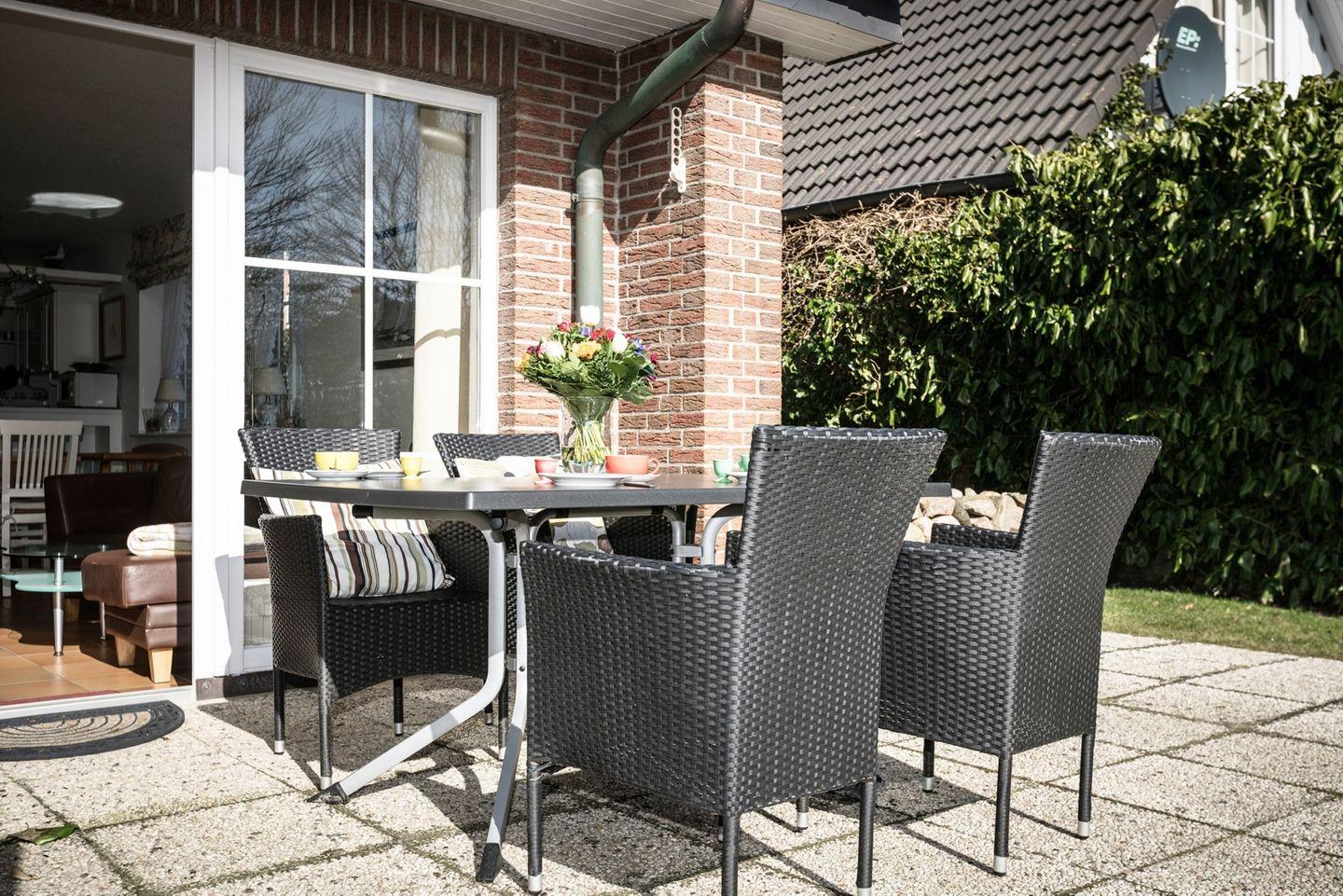 Ein besonderes Highlight ist die sonnige Terrasse: Hier können Sie den Tag mit einem Frühstück an der frischen Nordseeluft beginnen oder den Abend entspannt ausklingen lassen. Der gemeinschaftliche Garten bietet zusätzlichen Platz zum Verweilen und Genießen.