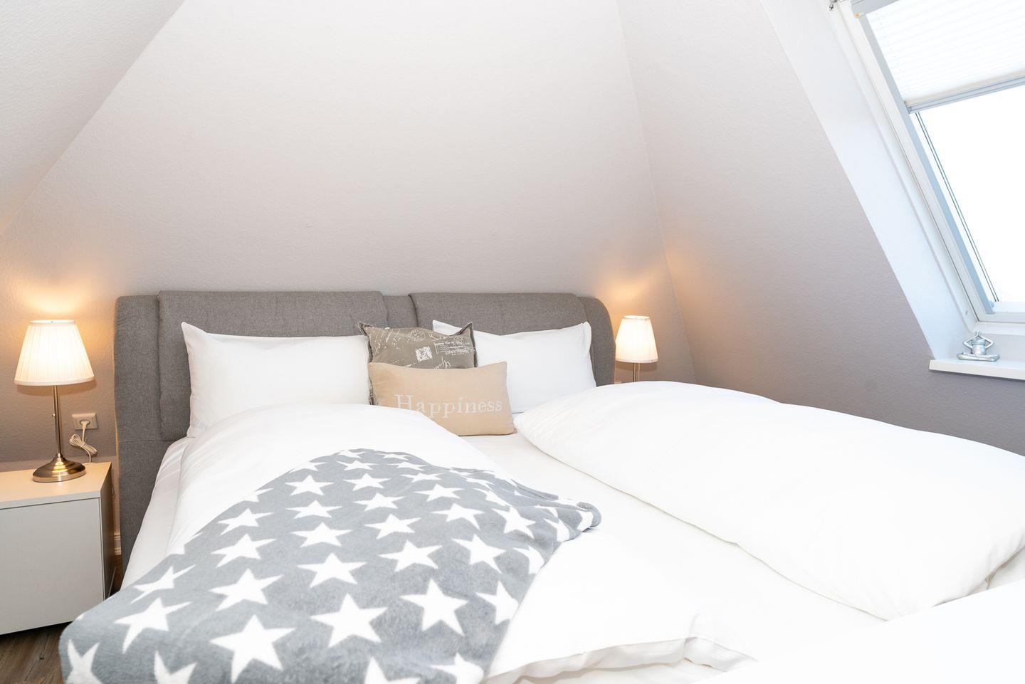 Die Wohnung verfügt über zwei separate Schlafzimmer, die ausreichend Platz und Rückzugsmöglichkeiten für alle Gäste bieten. Hier können Sie nach langen Strandtagen oder ausgedehnten Inselerkundungen erholsam schlafen.