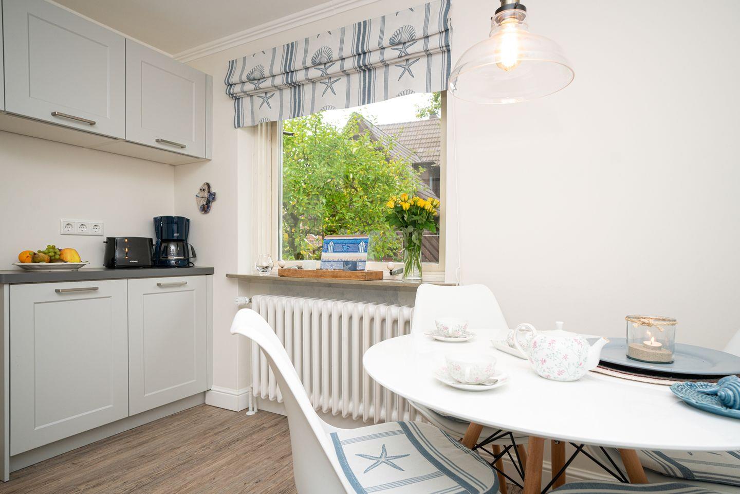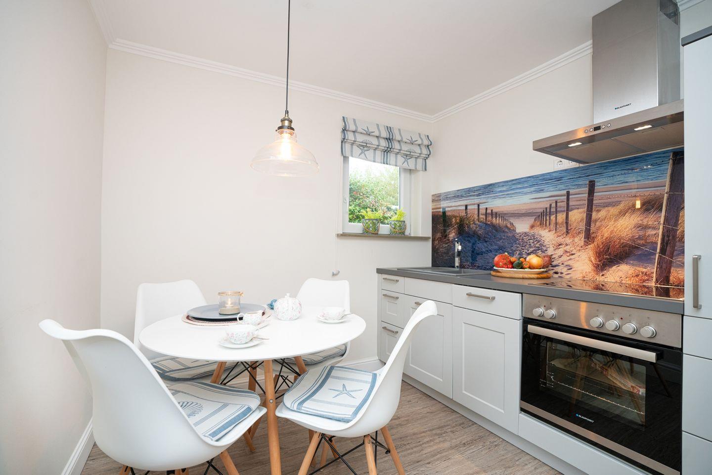 Der helle Wohnbereich lädt zum gemeinsamen Entspannen ein und öffnet sich zur Terrasse nach Osten und Süden, wo Sie sonnige Stunden genießen können. Die angrenzende, voll ausgestattete Küche mit Essplatz bietet Ihnen alle Annehmlichkeiten für die Selbstverpflegung im Urlaub, vom morgendlichen Frühstück bis zum gemütlichen Abendessen.