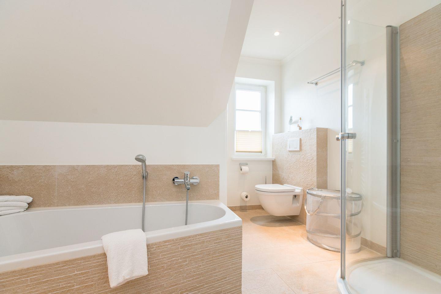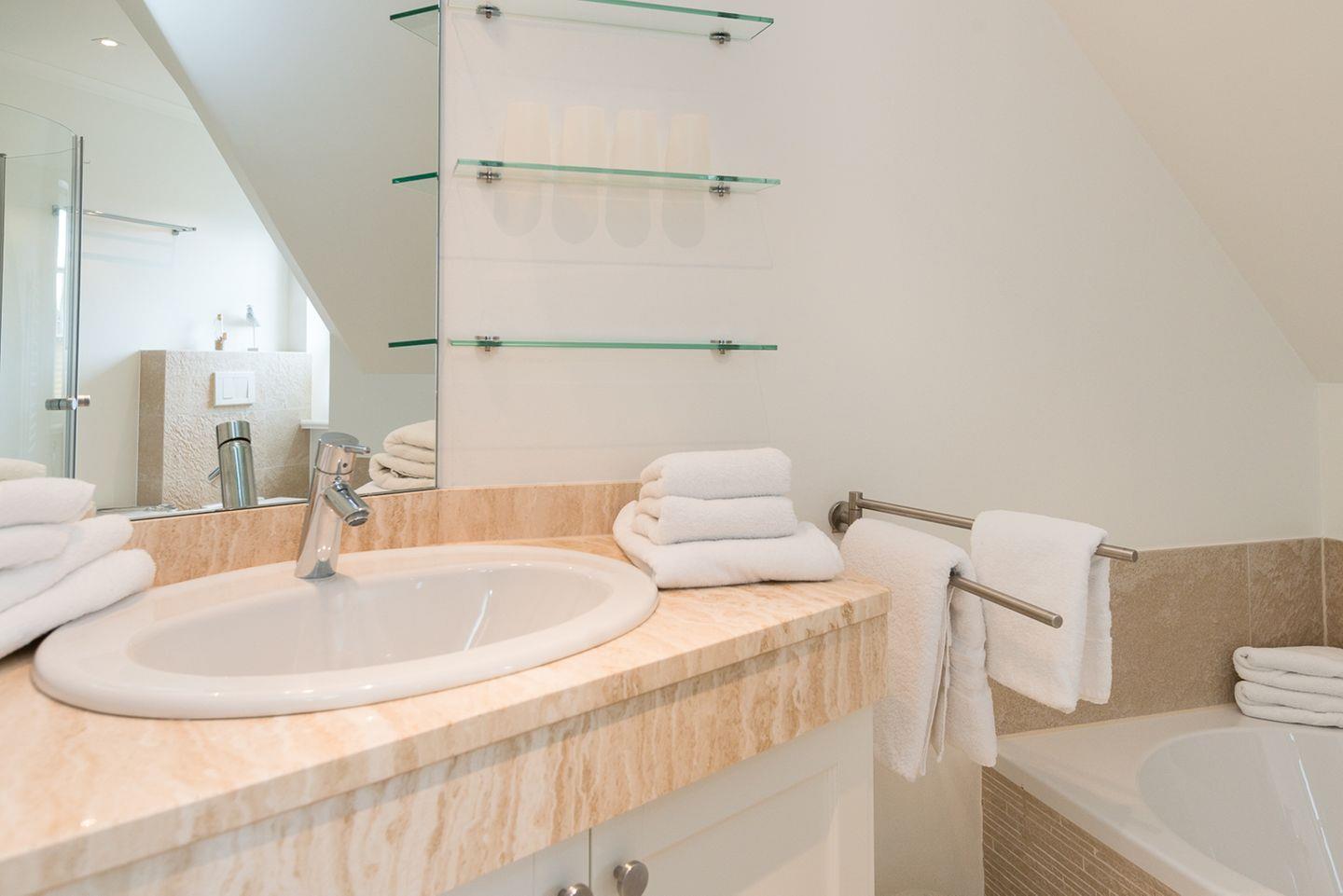 Das Badezimmer ist funktional und freundlich gestaltet und verfügt über eine Dusche, WC und einen modernen Waschtisch – perfekt für den Start in den Tag oder zur Erfrischung nach einem Strandspaziergang.
